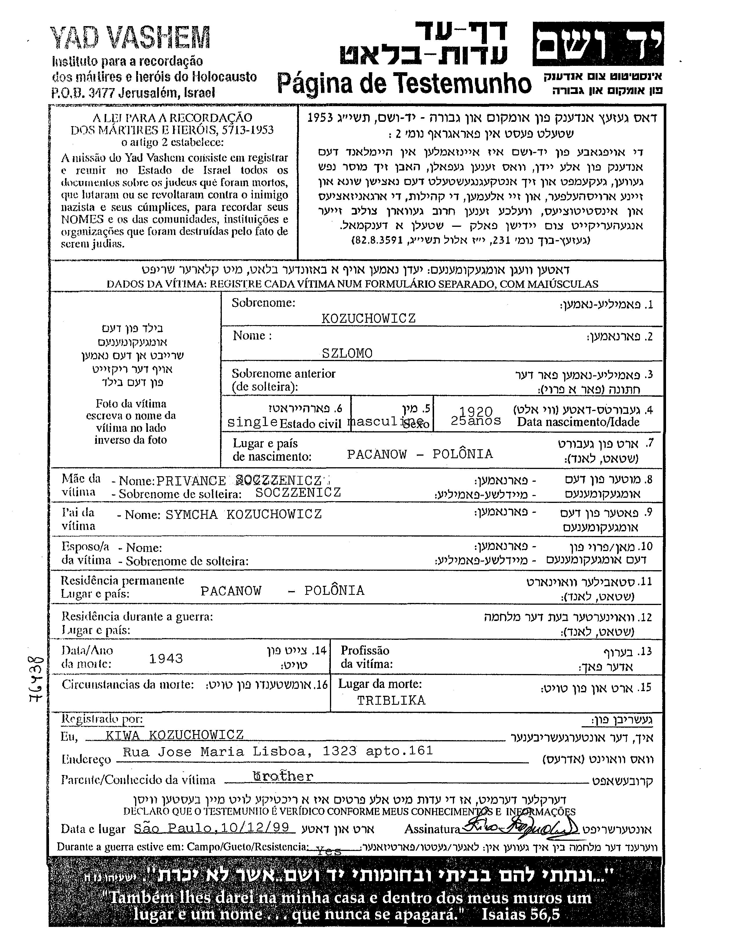 Kozuchowicz Szlomo 1920 Pacanow, Polen Gedenkblatt