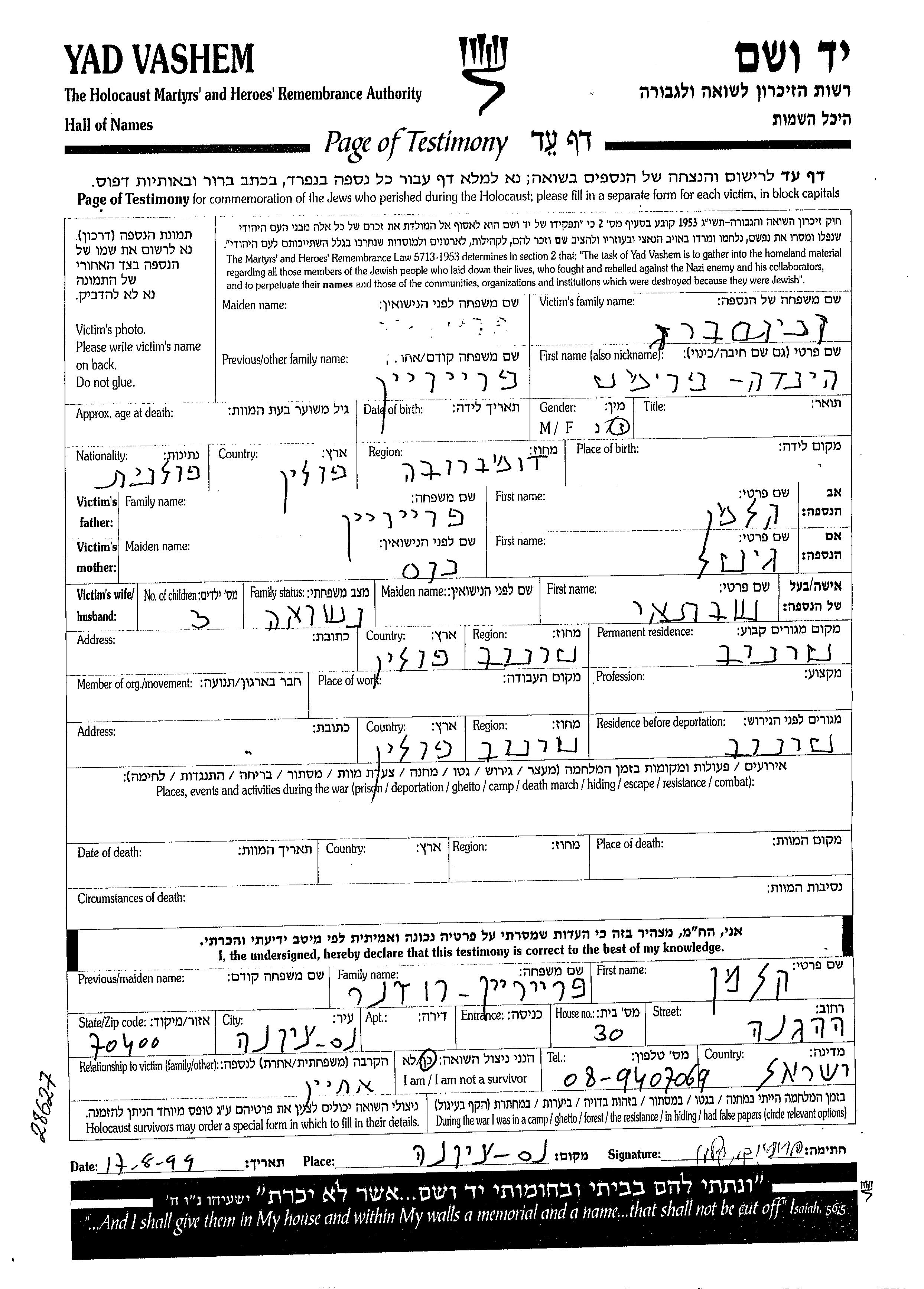 Hinda Frimet Kenigsberg, geb. Freireikh wurde in Dąbrowa, Polen geboren. Sie war die Tochter von Kalman und Gitel. Sie war mit Shabtai Verheiratet. Vor dem Zweiten Weltkrieg lebte sie in Tarnow, Polen. Während des Krieges war sie in Tarnow, Polen.