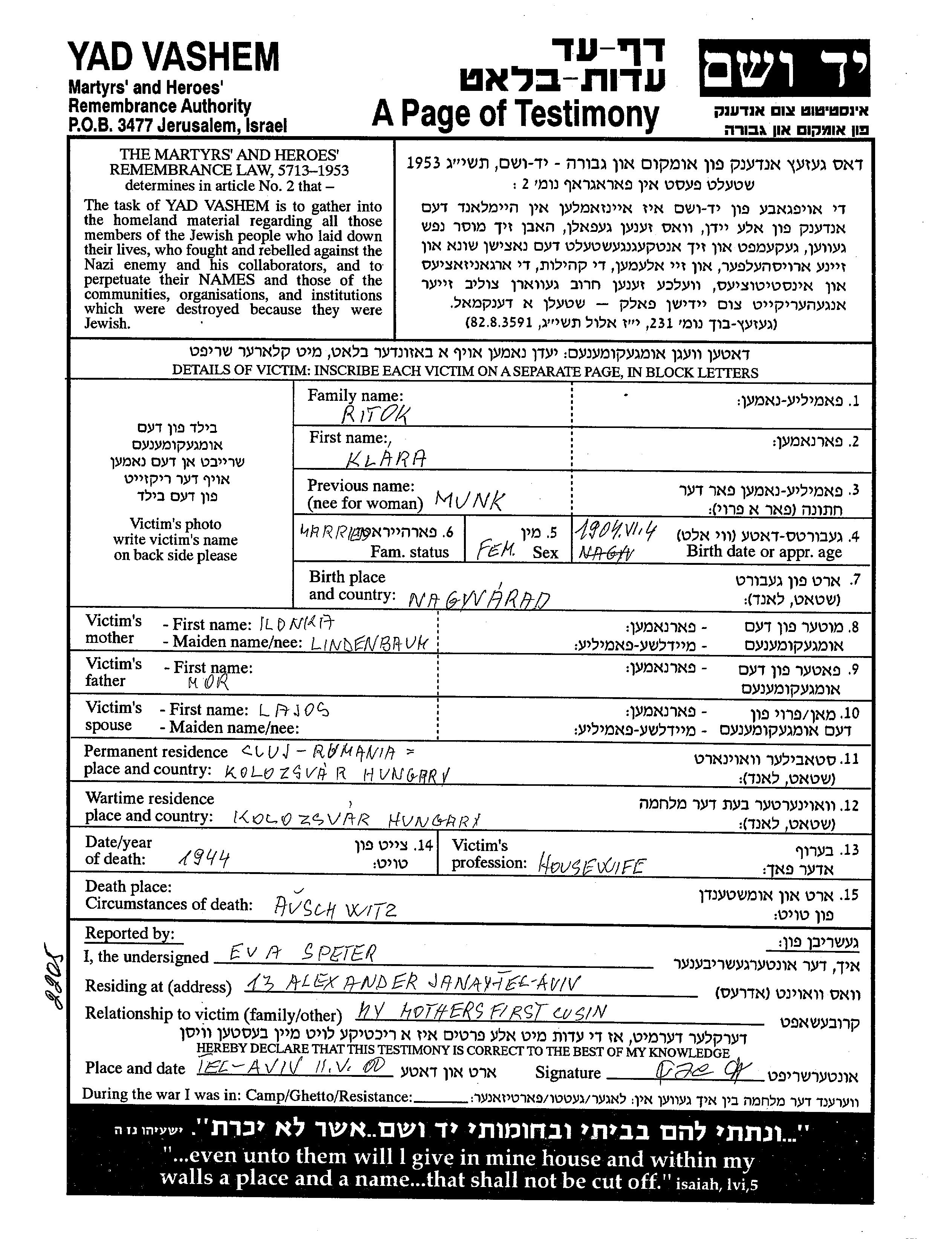 Klara Ritok, geb. Munk wurde im Jahr 1904 in Nagyvarad, Rumänien geboren. Sie war die Tochter von Ilonka und Mor. Sie war Hausfrau und Verheiratet. Vor dem Zweiten Weltkrieg lebte sie in Cluj, Rumänien. Während des Krieges war sie in Koloszvar, Rumänien.