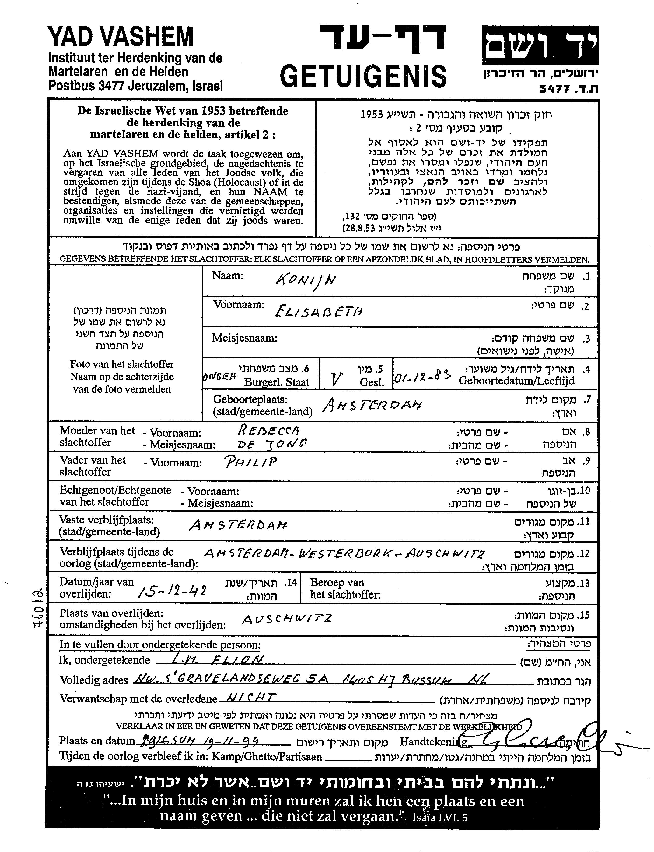 Elisabeth Konijn wurde im Jahr 1883 in Amsterdam, Niederlande geboren. Sie war die Tochter von Philip und Rebecca. Sie war Ledig. Vor dem Zweiten Weltkrieg lebte sie in Amsterdam, Niederlande. Während des Krieges war sie in Amsterdam, Niederlande.