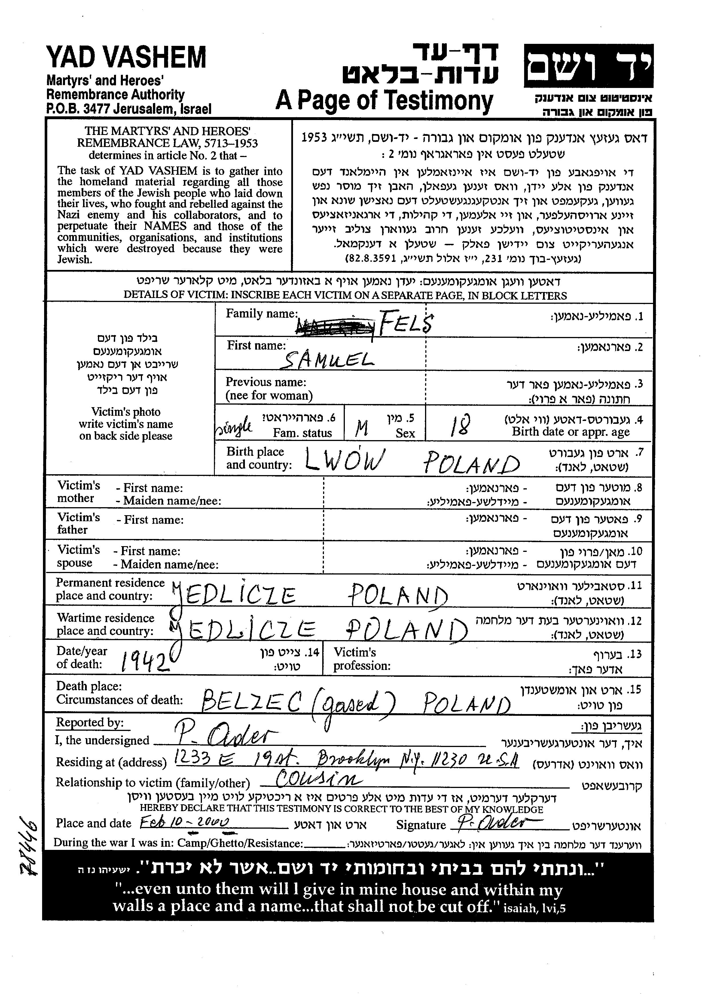 Samuel wurde in der Schoah ermordet. Todesort: Belzec, Polen im Jahr 1942.