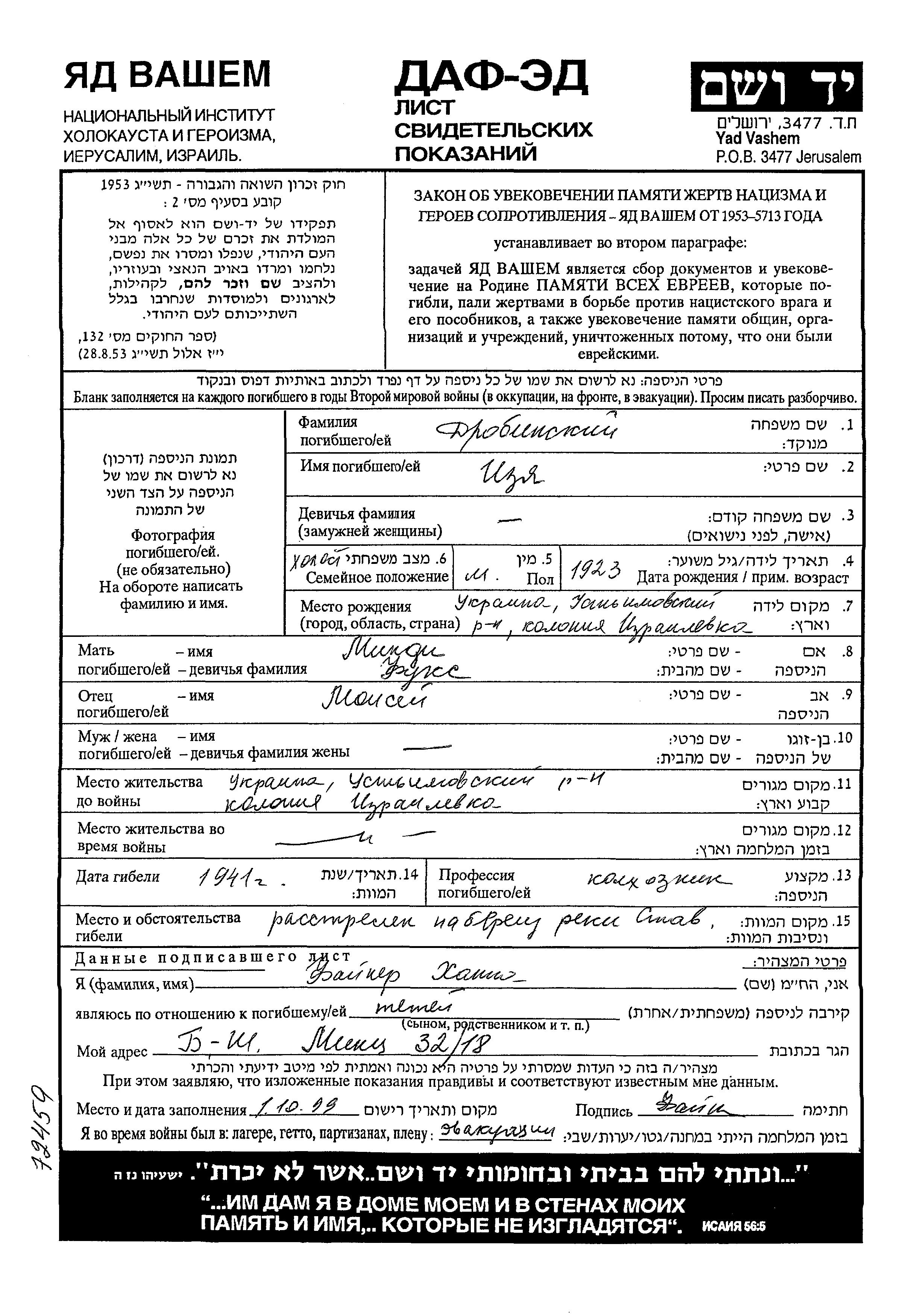 Drobinski Fuks Izya 1923 Izrailovka, Ukraine (UdSSR) Gedenkblatt
