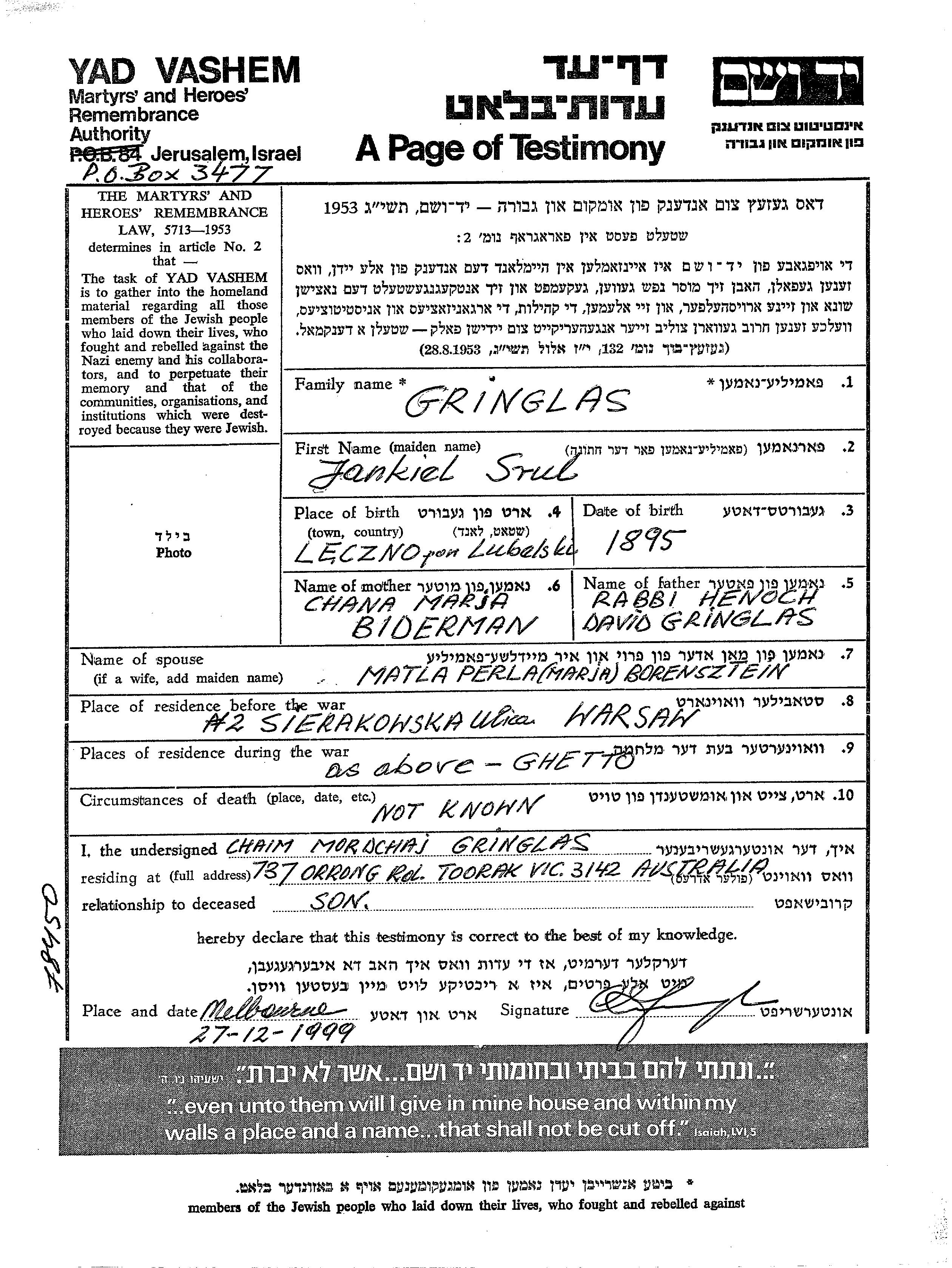 Jankiel Srul Gringlas wurde im Jahr 1895 in Leczna, Polen geboren. Er war der Sohn von Henoch David und Chana Marja. Er war mit Matla Perla, geb. Borensztein Verheiratet. Vor dem Zweiten Weltkrieg lebte er in Warszawa, Polen. Während des Krieges war er in Warszawa, Polen.