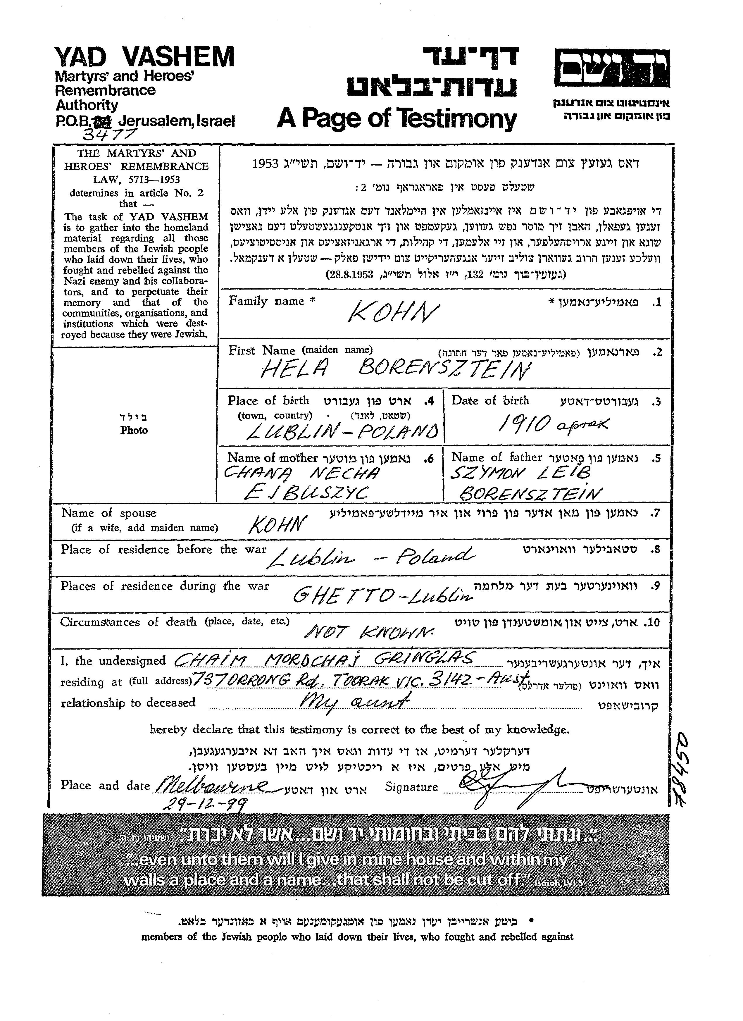 Hela Kohn, geb. Borensztein wurde im Jahr 1910 in Lublin, Polen geboren. Sie war die Tochter von Szymon Leib und Chana Necha. Sie war Verheiratet. Vor dem Zweiten Weltkrieg lebte sie in Lublin, Polen. Während des Krieges war sie in Lublin, Polen.