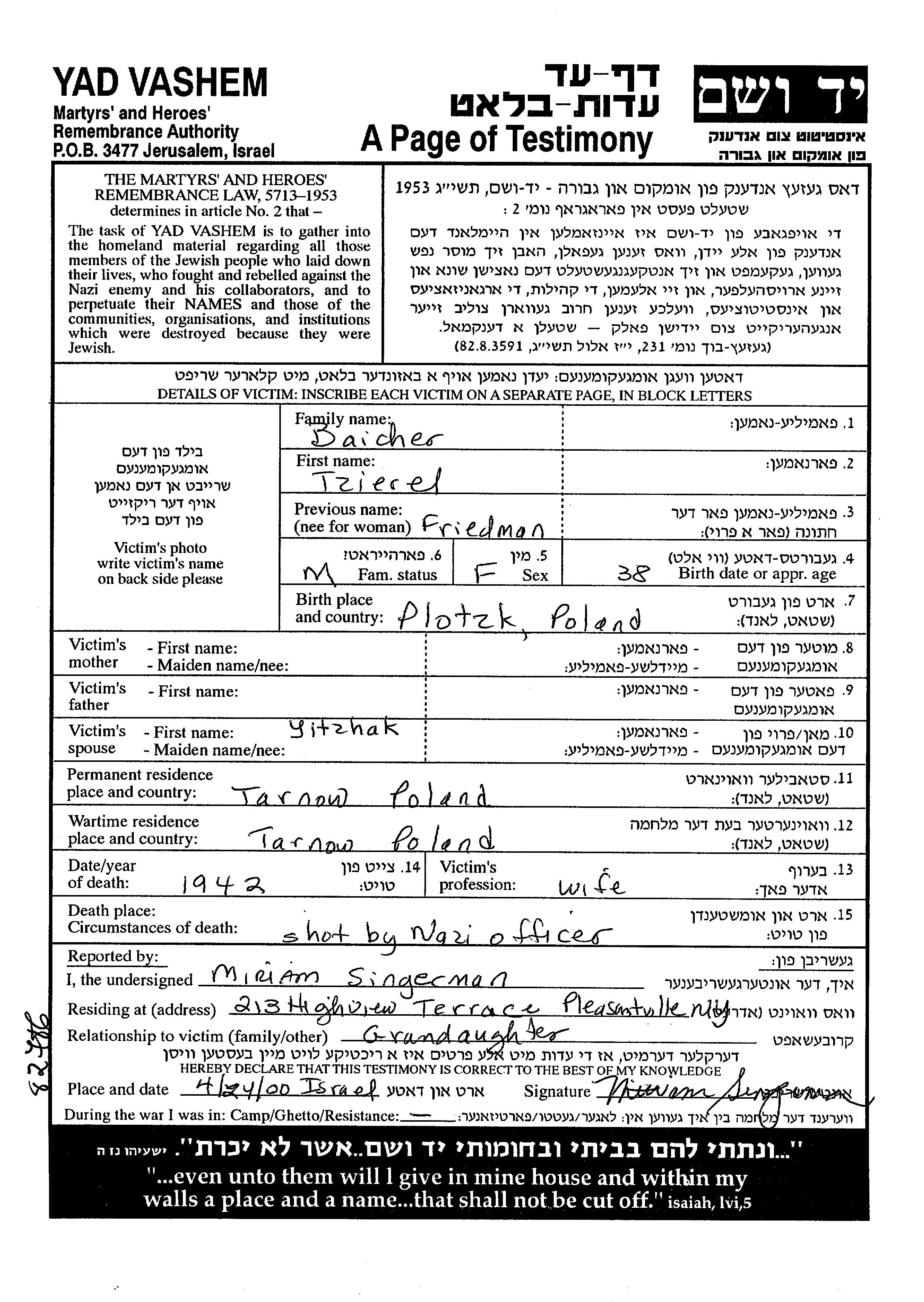 Tzierel Daicher, geb. Friedman wurde in Plotzk, Polen geboren. Sie war Hausfrau und mit Yitzhak Verheiratet. Vor dem Zweiten Weltkrieg lebte sie in Tarnow, Polen. Während des Krieges war sie in Tarnow, Polen.