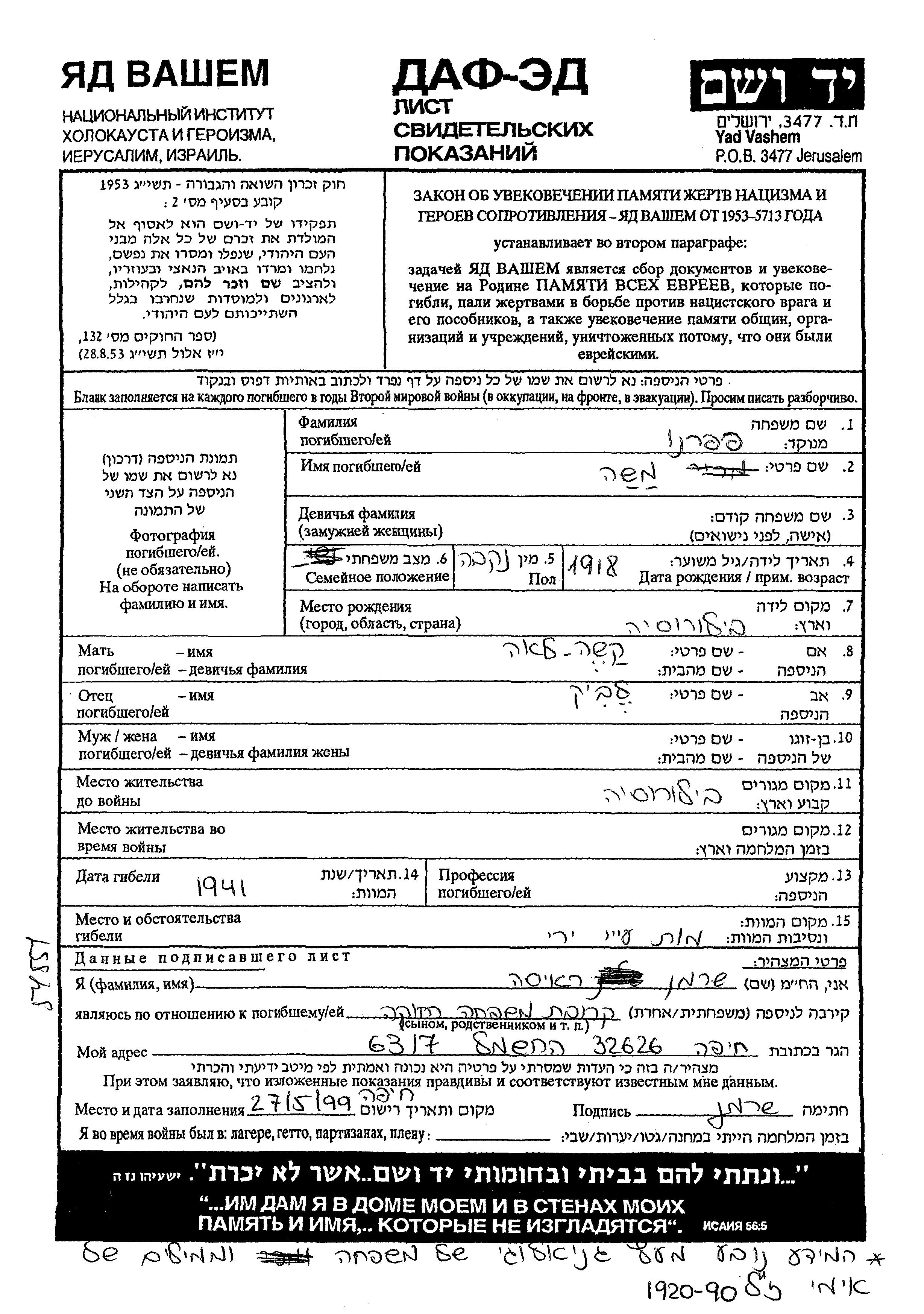 Paperni Moshe 1918 Weißrussland (UdSSR) Gedenkblatt