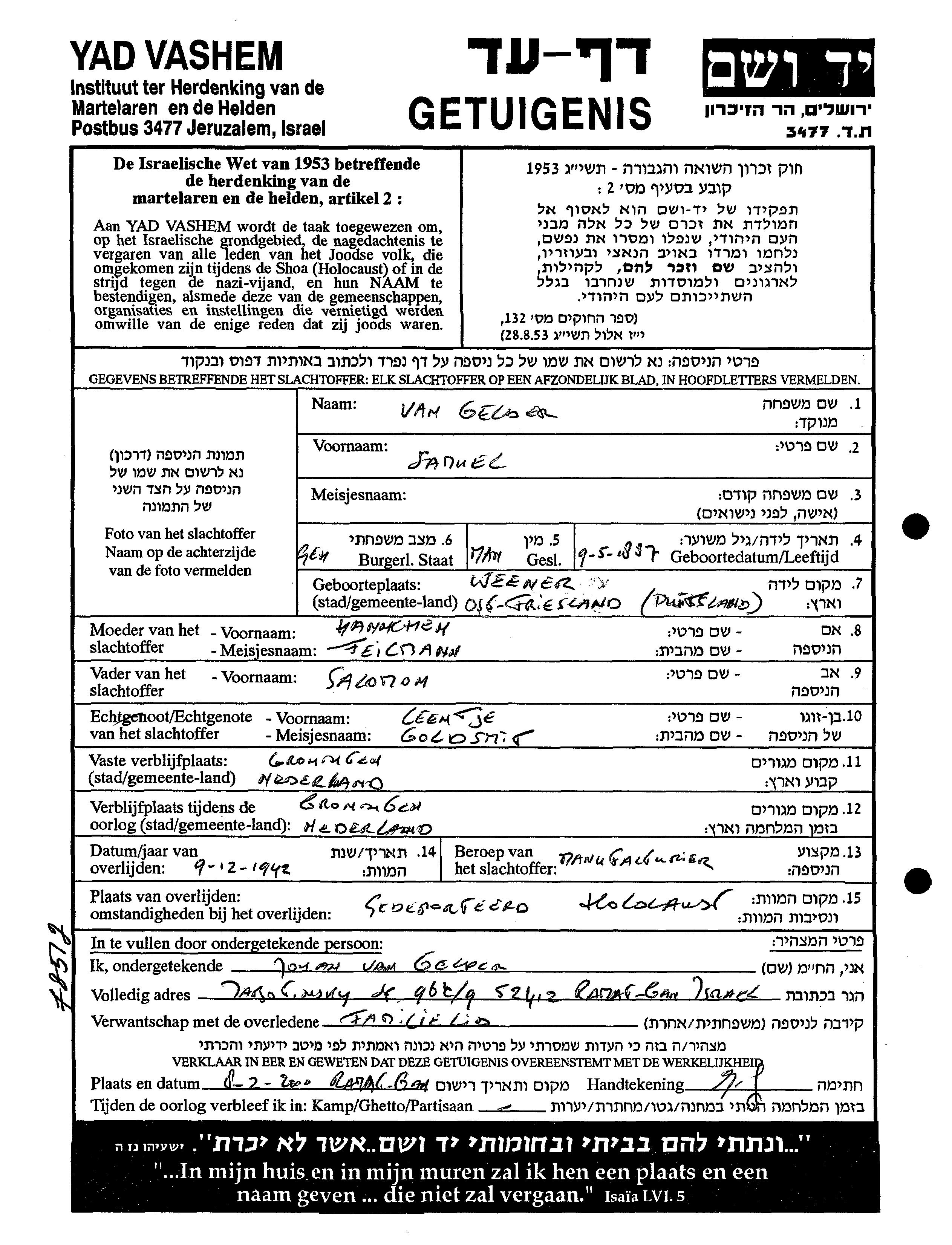 Samuel Gelder van wurde im Jahr 1897 in Weener Ems, Deutsches Reich geboren. Er war der Sohn von Salomon und Hannchen. Er war Fabrikant und mit Leentje, geb. Goldsmit Verheiratet. Vor dem Zweiten Weltkrieg lebte er in Groningen, Niederlande. Während des Krieges war er in Groningen, Niederlande.