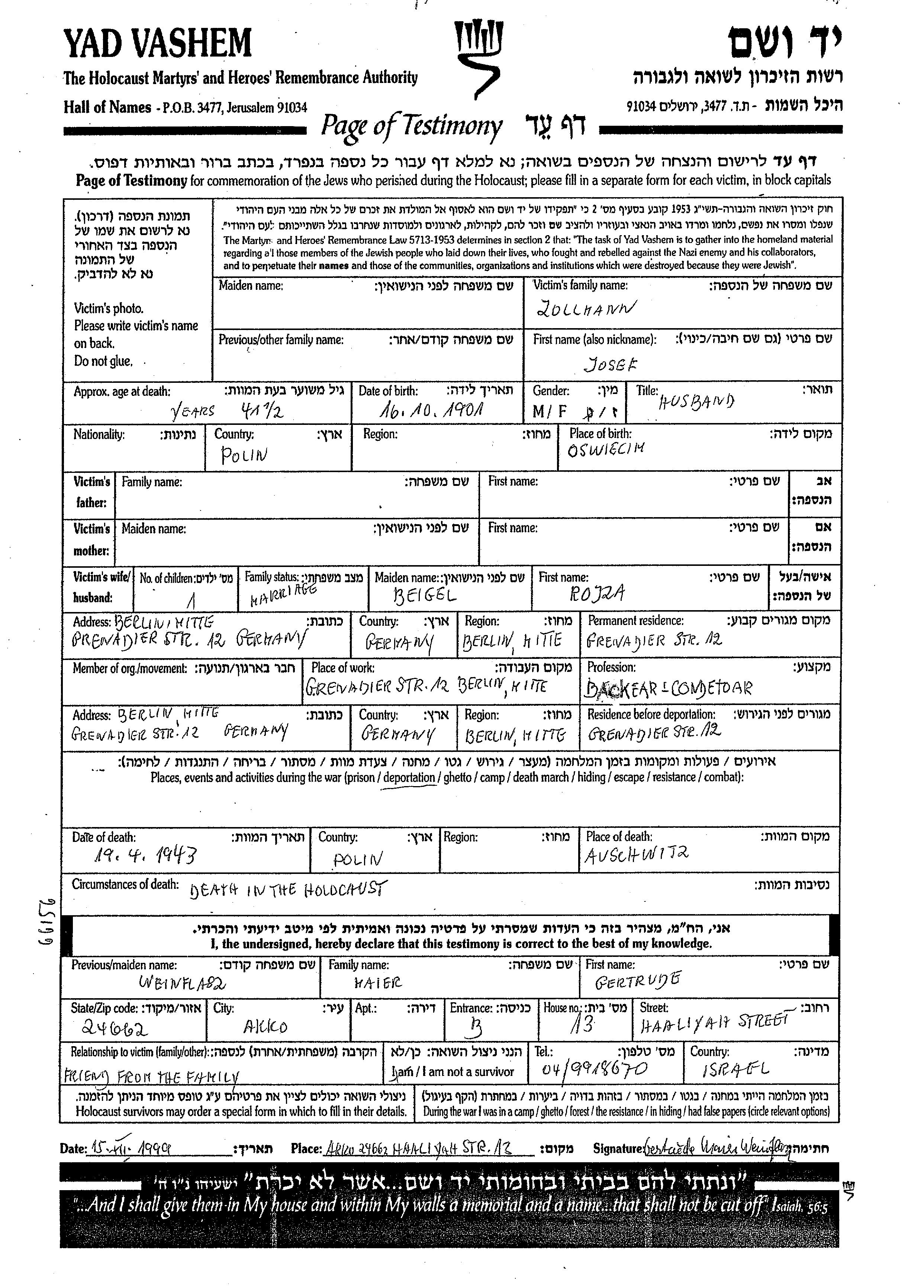 Josef wurde in der Schoah ermordet. Todesort: Auschwitz, Polen im Jahr 1943.