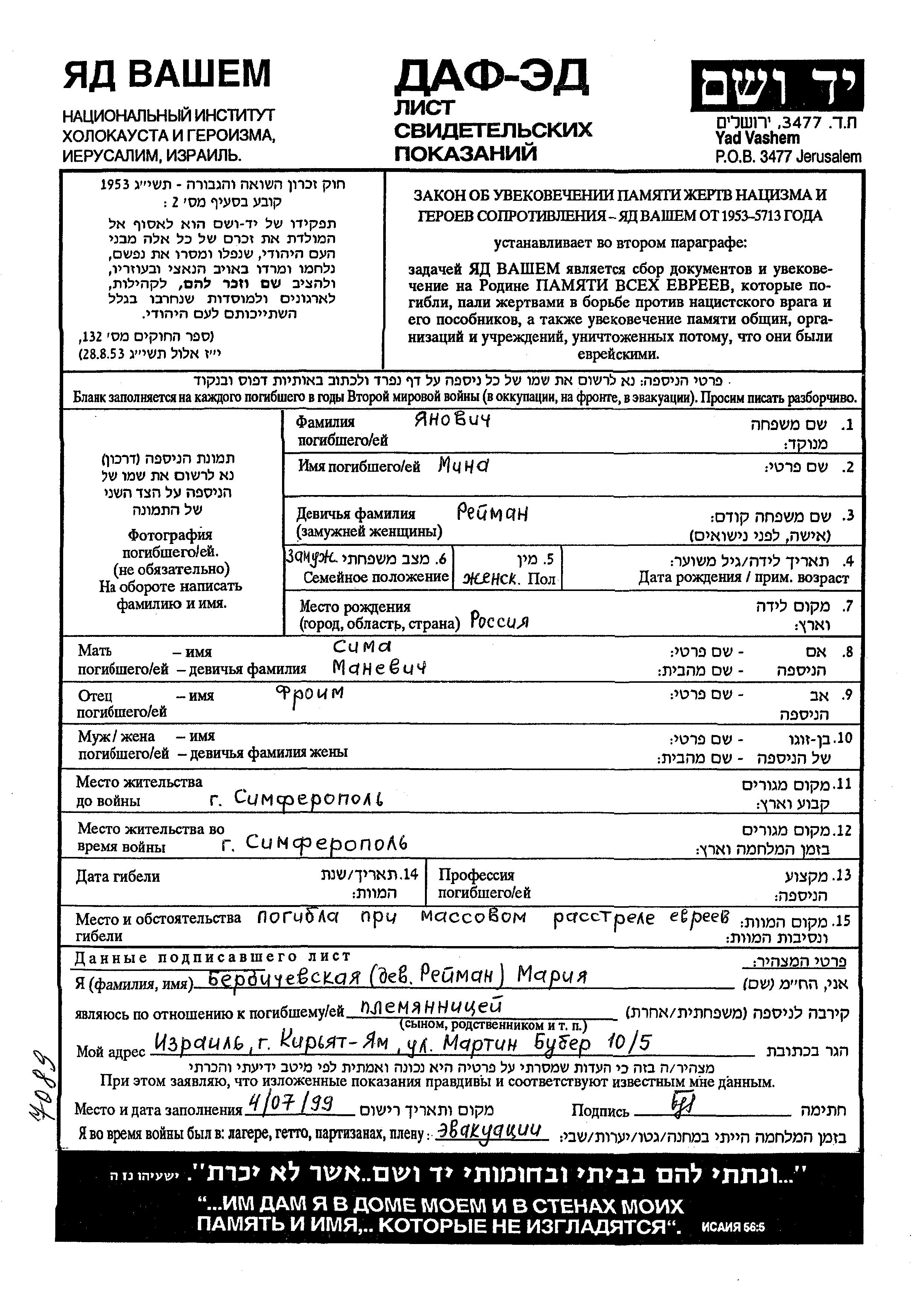 Mina Yanovich, geb. Reiman wurde in Russland (UdSSR) geboren. Sie war die Tochter von Froim und Sima. Sie war Verheiratet. Vor dem Zweiten Weltkrieg lebte sie in Simferopol, Russland (UdSSR). Während des Krieges war sie in Simferopol, Russland (UdSSR).