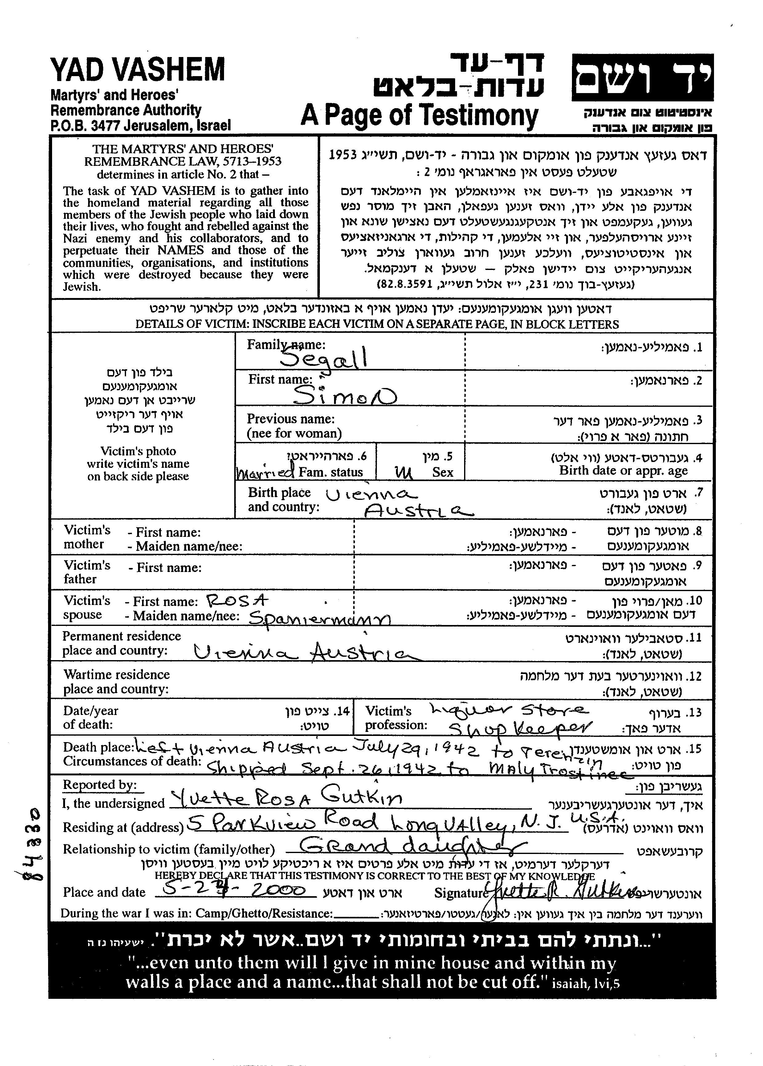 Simon Segall wurde in Wien, Österreich geboren. Er war Ladenbesitzer/-in und mit Rosa, geb. Spaniermann Verheiratet. Vor dem Zweiten Weltkrieg lebte er in Wien, Österreich. Während des Krieges war er in Theresienstadt, Tschechoslowakei.