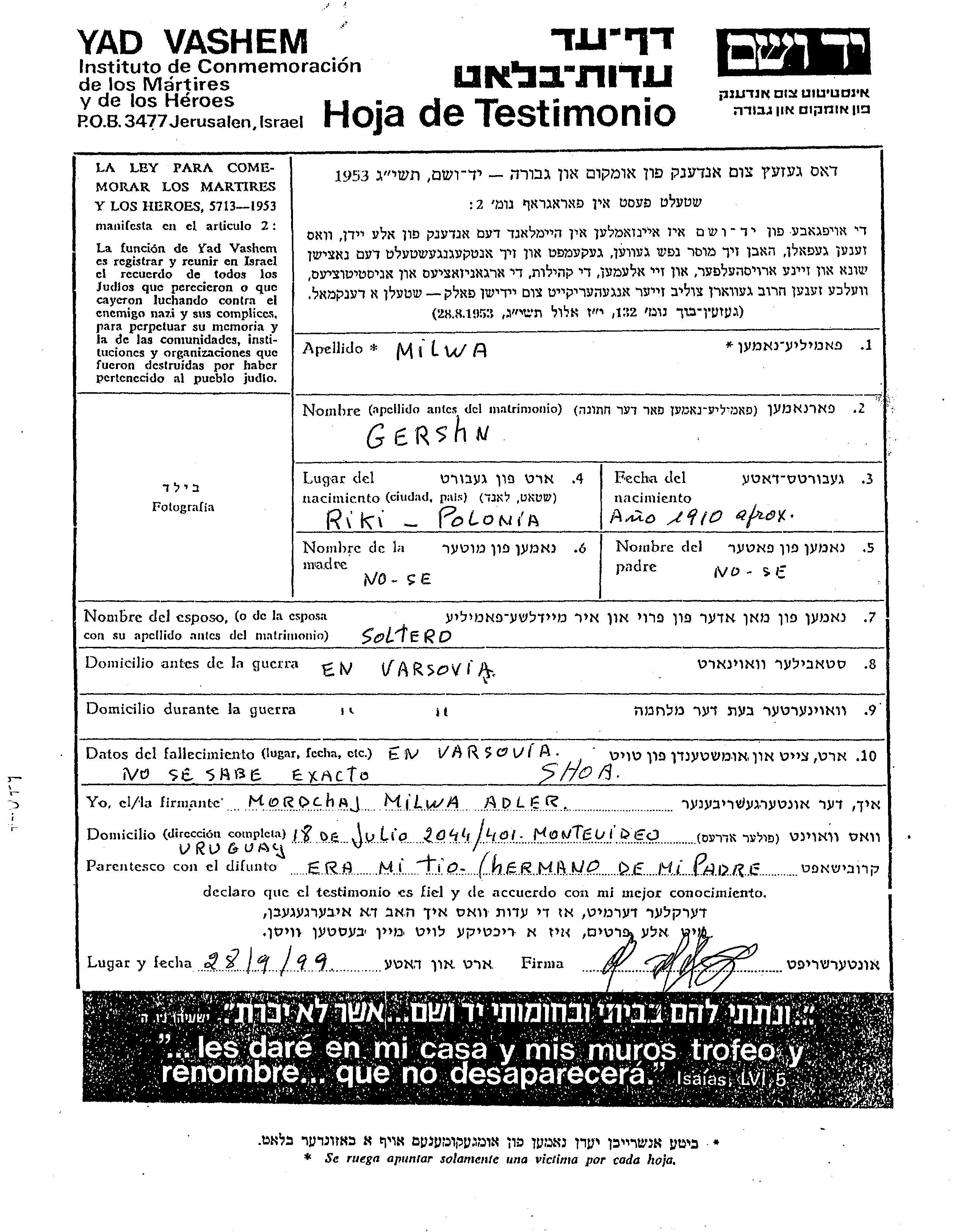 Gershn Milwa wurde im Jahr 1910 in Riki, Polen geboren. Vor dem Zweiten Weltkrieg lebte er in Varsha, Polen. Während des Krieges war er in Varsha, Polen.
