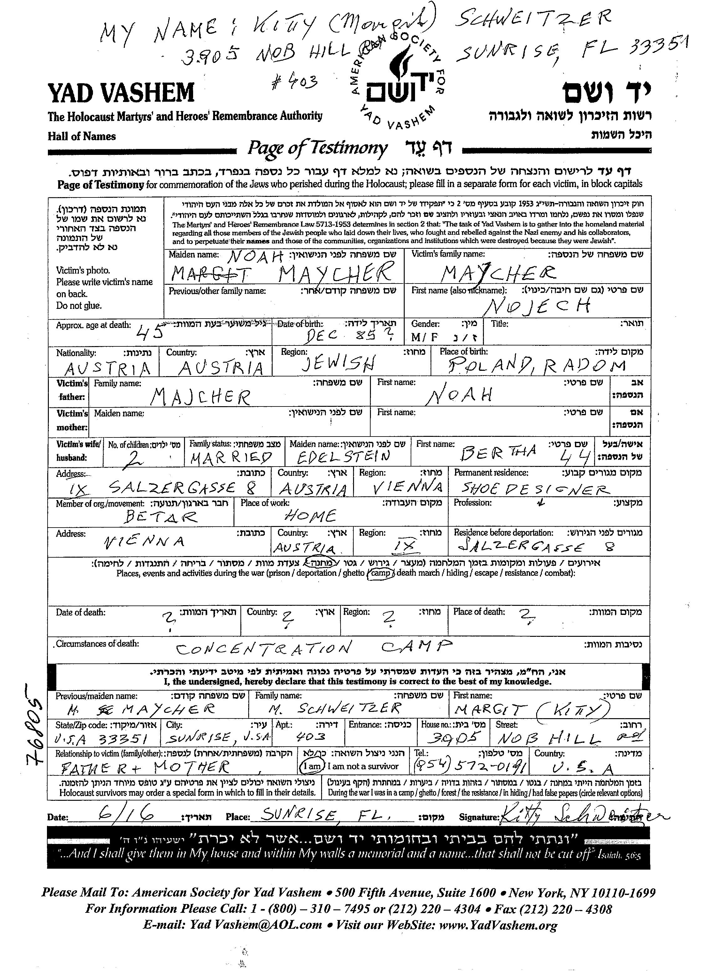 Nojech Maycher wurde im Jahr 1885 in Radom, Polen geboren. Er war der Sohn von Noah. Er war Shoe designer und mit Bertha, geb. Edelstein Verheiratet. Vor dem Zweiten Weltkrieg lebte er in Wien, Österreich. Während des Krieges war er in Wien, Österreich.