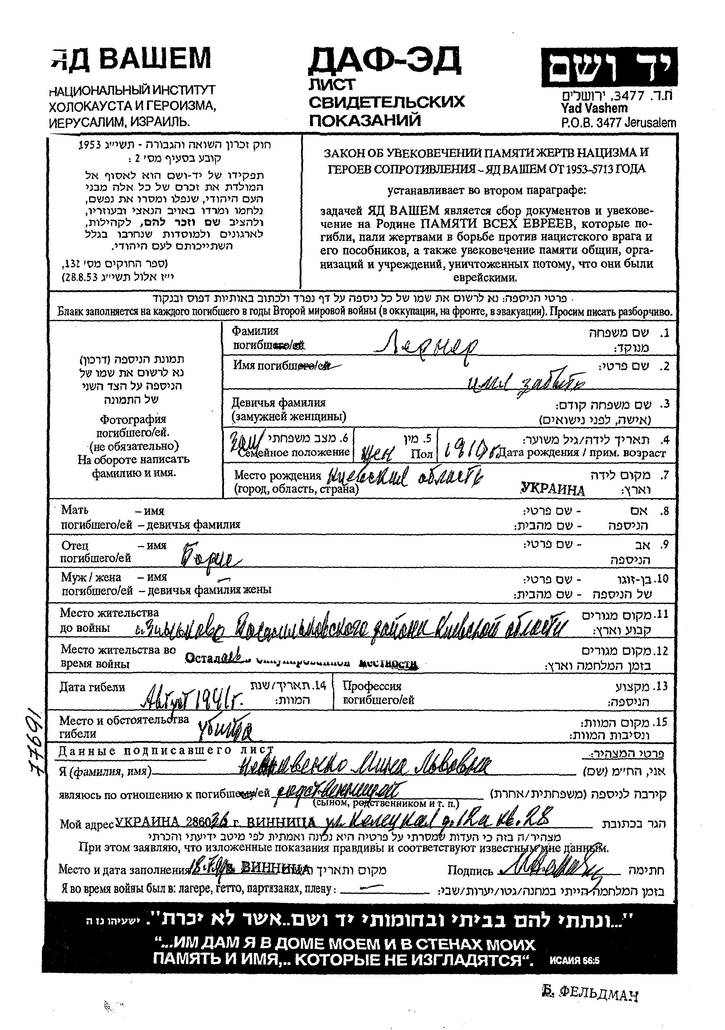 Lerner Vorname unbekannt 1910 Zinkovtsy, Ukraine (UdSSR) Gedenkblatt