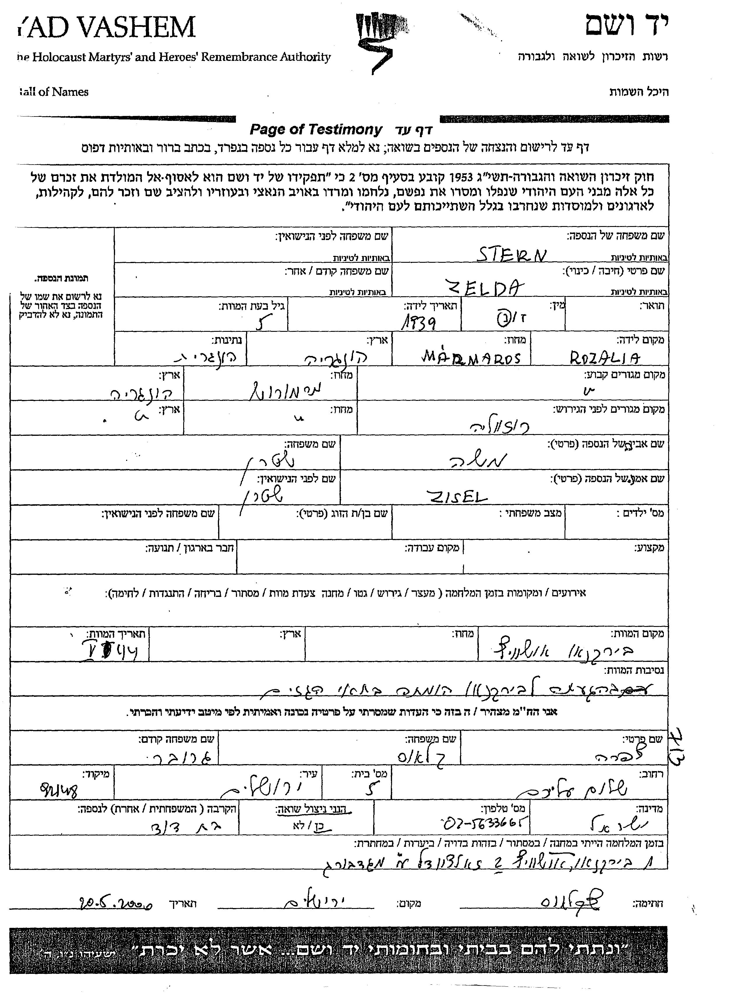 Zelda Stern wurde im Jahr 1939 in Rozalia, Rumänien geboren. Sie war die Tochter von Moshe und Zisel.