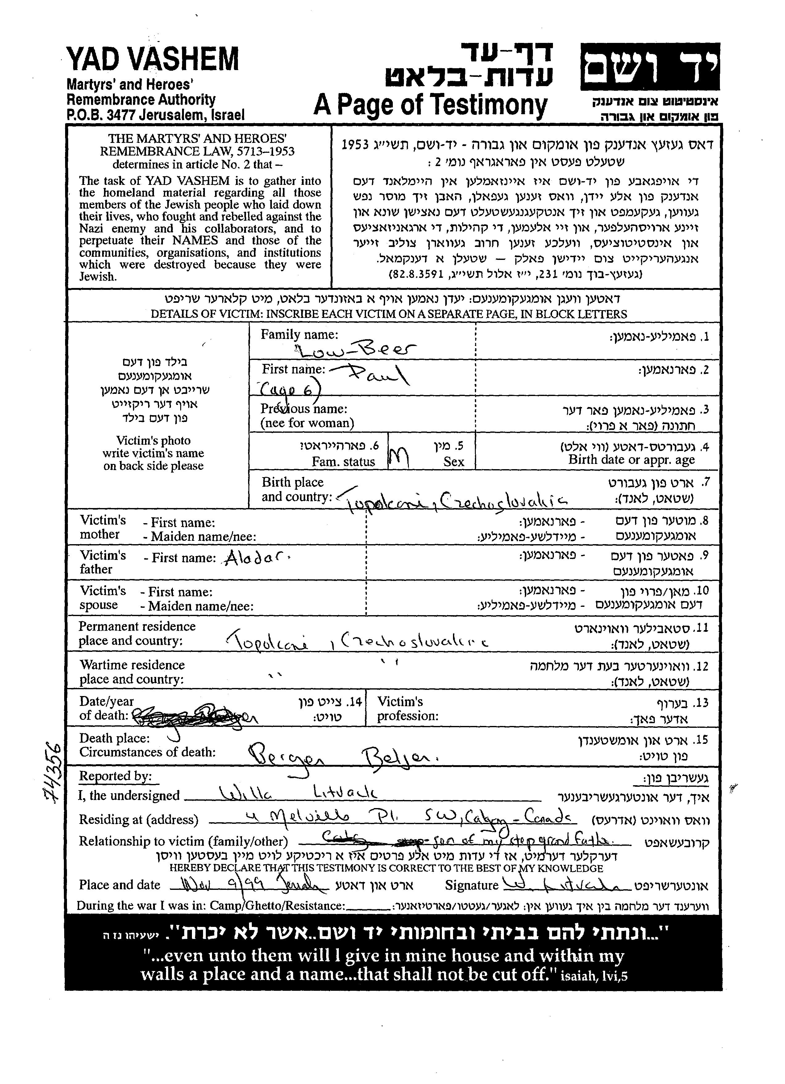 Paul Lowbeer wurde in Topolcany, Tschechoslowakei geboren. Er war der Sohn von Aladar. Vor dem Zweiten Weltkrieg lebte er in Topolcany, Tschechoslowakei. Während des Krieges war er in Topolcany, Tschechoslowakei.