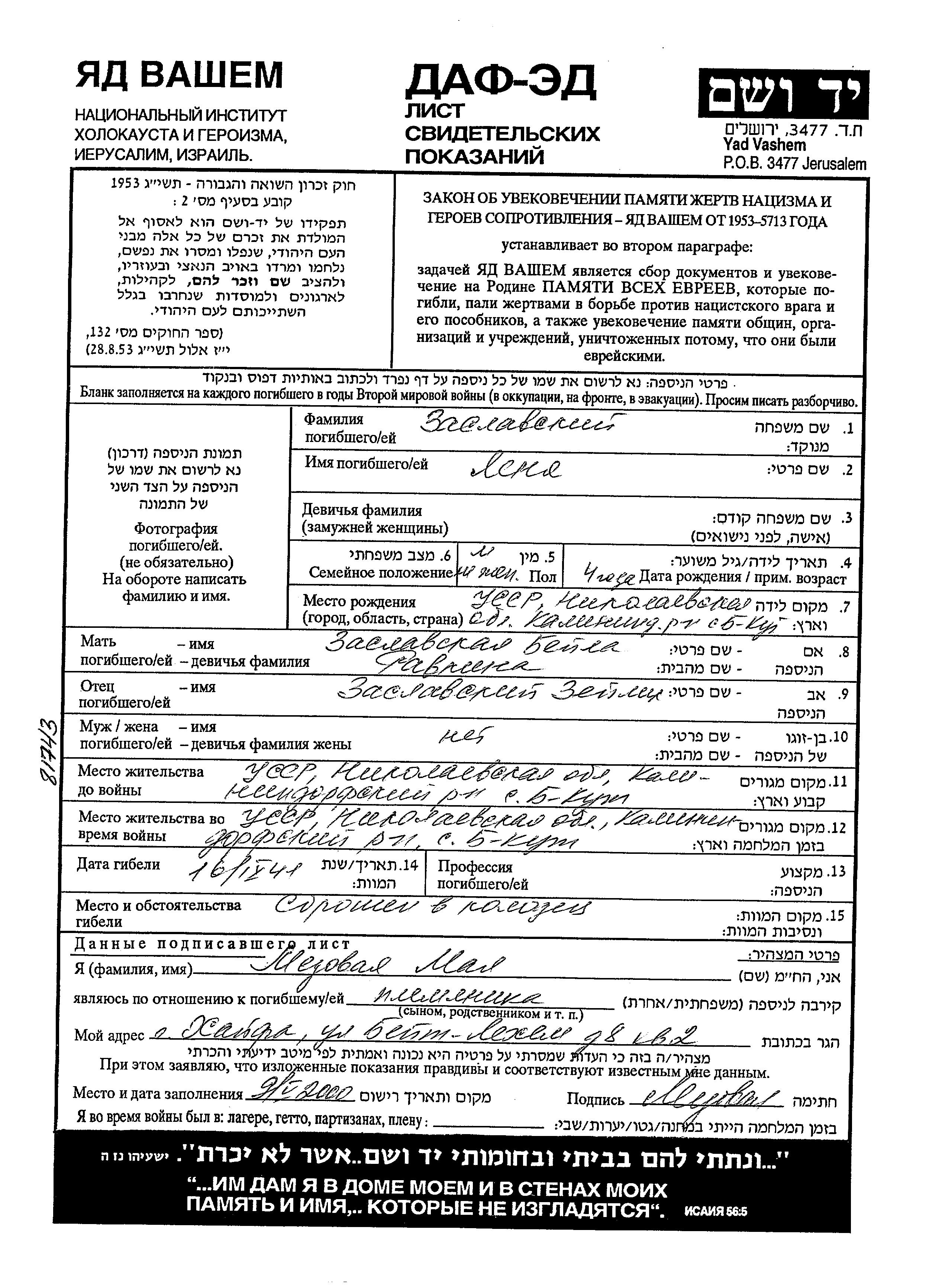 Lenya Zaslavski wurde in Bobrovyy Kut, Ukraine (UdSSR) geboren. Er war der Sohn von Zeilik und Beila. Er war Kind. Vor dem Zweiten Weltkrieg lebte er in Bobrovyy Kut, Ukraine (UdSSR). Während des Krieges war er in Bobrovyy Kut, Ukraine (UdSSR).