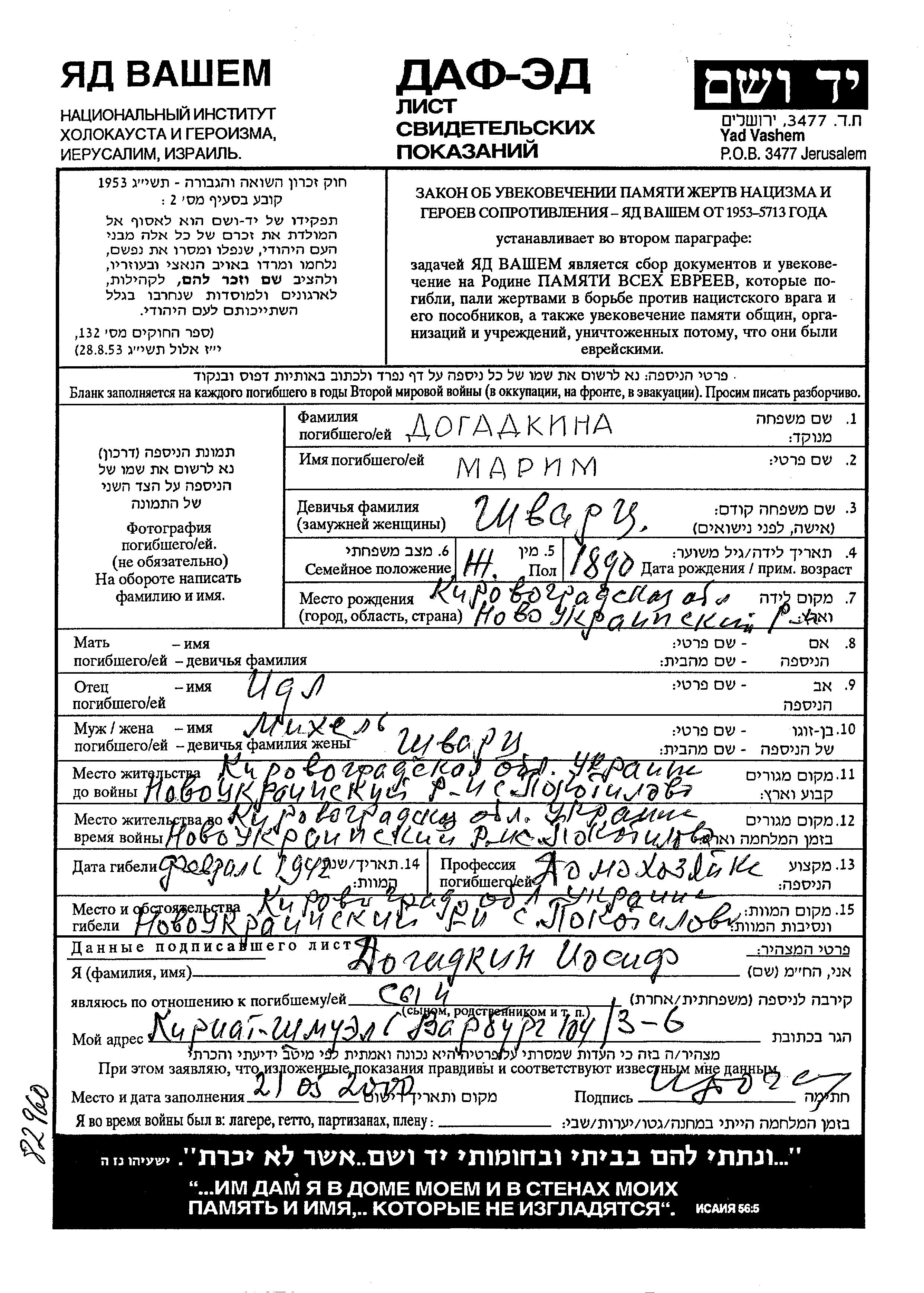 Marim Dogadkin Shvartz, geb. Dogadkin wurde im Jahr 1890 in Novo Ukrainka, Ukraine (UdSSR) geboren. Sie war die Tochter von Idl. Sie war Hausfrau und mit Mikhel Verheiratet. Vor dem Zweiten Weltkrieg lebte sie in Pokotilovo, Ukraine (UdSSR). Während des Krieges war sie in Pokotilovo, Ukraine (UdSSR).