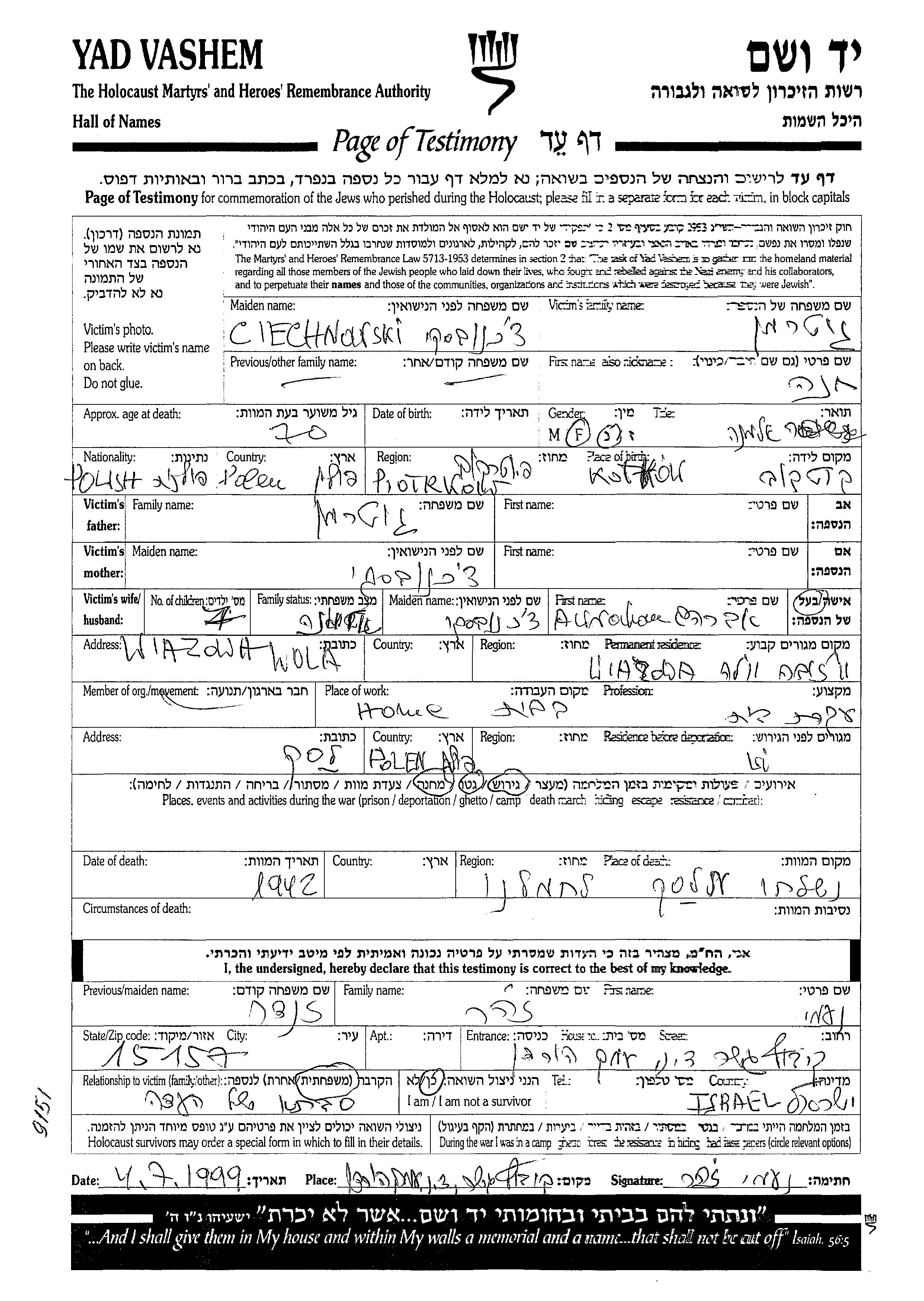 Guterman Khana Wiazowa Wola, Polen Gedenkblatt