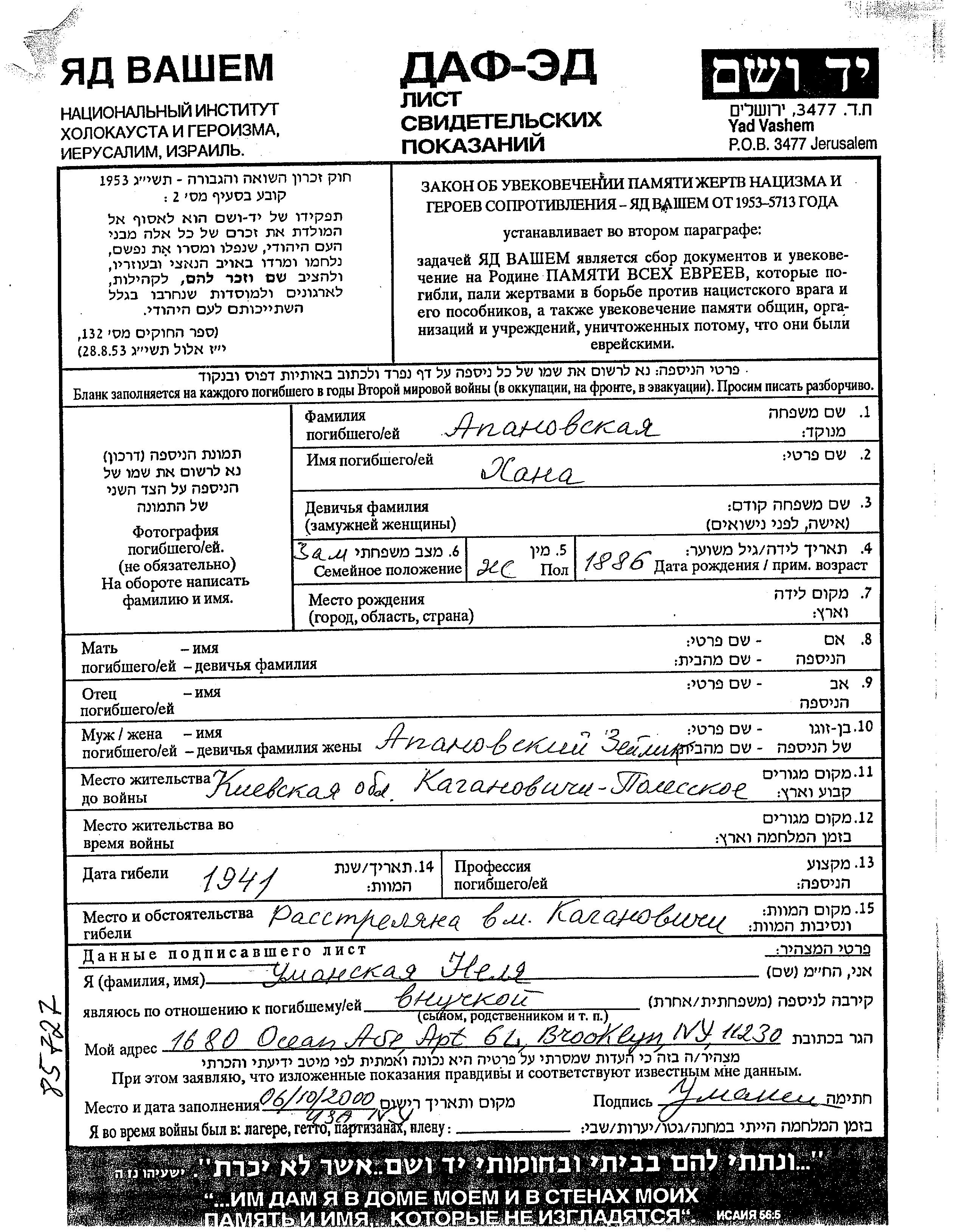 Khana Apanovski wurde im Jahr 1886 geboren. Sie war mit Zeilik Verheiratet. Vor dem Zweiten Weltkrieg lebte sie in Kaganovichi Pervyye, Ukraine (UdSSR). Während des Krieges war sie in Kaganovichi Pervyye, Ukraine (UdSSR).