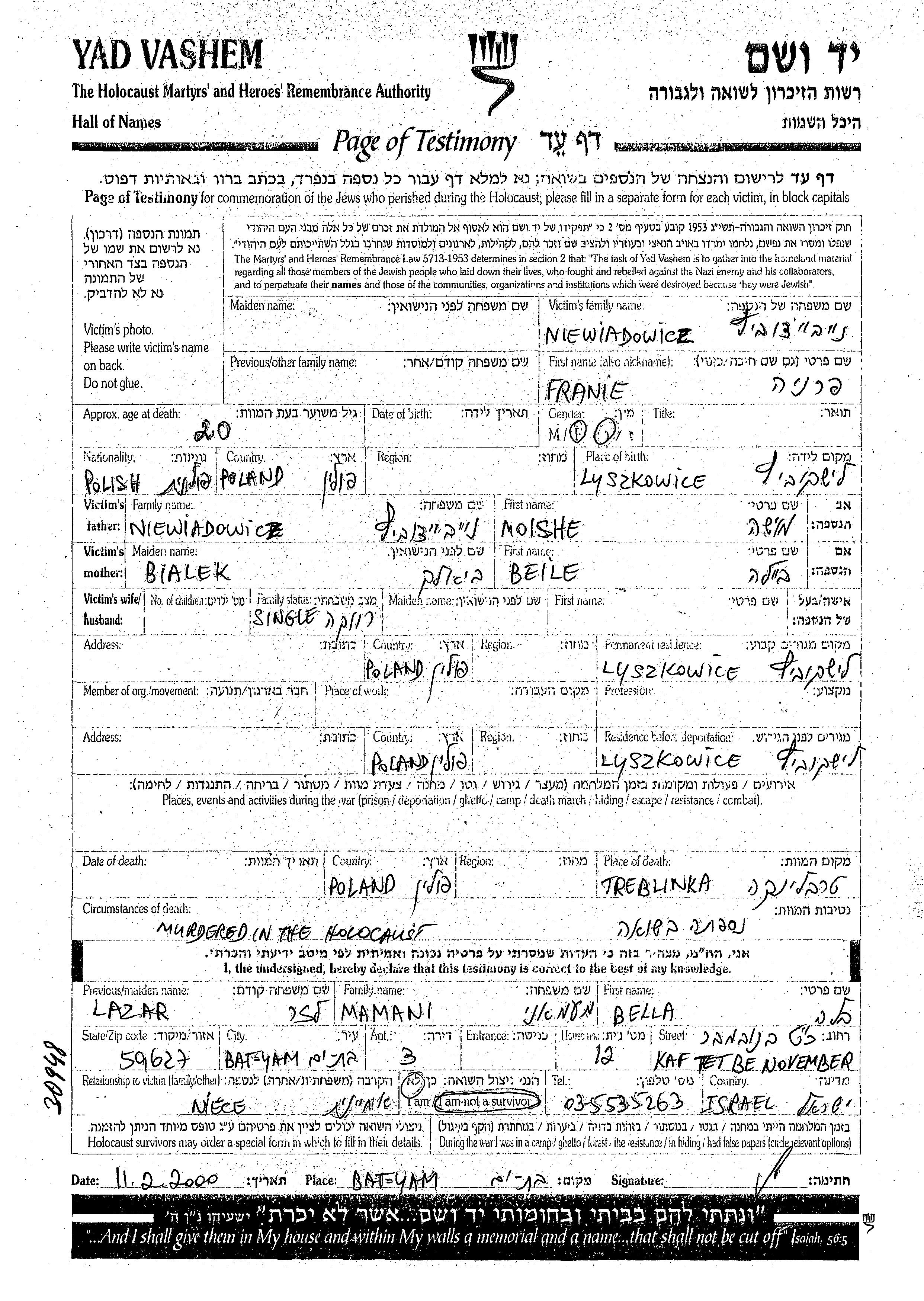Franie Niewiadowicz wurde in Lyszkowice, Polen geboren. Sie war die Tochter von Moishe und Beile. Sie war Ledig. Vor dem Zweiten Weltkrieg lebte sie in Lyszkowice, Polen. Während des Krieges war sie in Lyszkowice, Polen.
