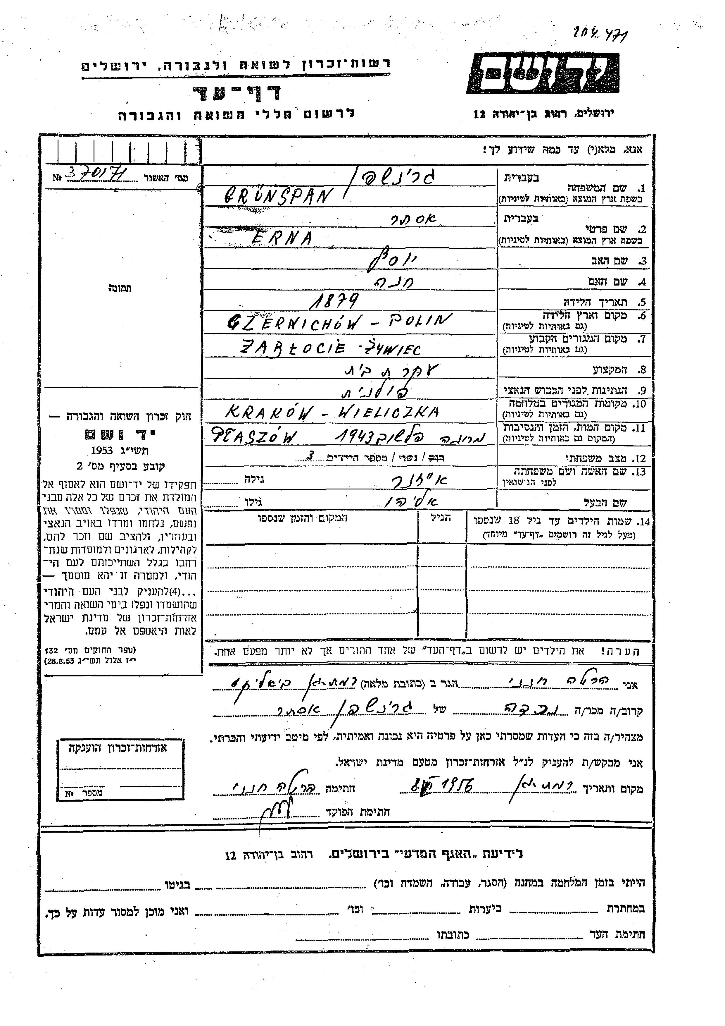 Erna Ester Grinspan, geb. Eizner wurde im Jahr 1879 in Czernichow, Polen geboren. Sie war die Tochter von Yosef und Khana. Sie war Hausfrau und mit Eliahu Verheiratet. Vor dem Zweiten Weltkrieg lebte sie in Zywiec, Polen. Während des Krieges war sie in Wieliczka, Polen.