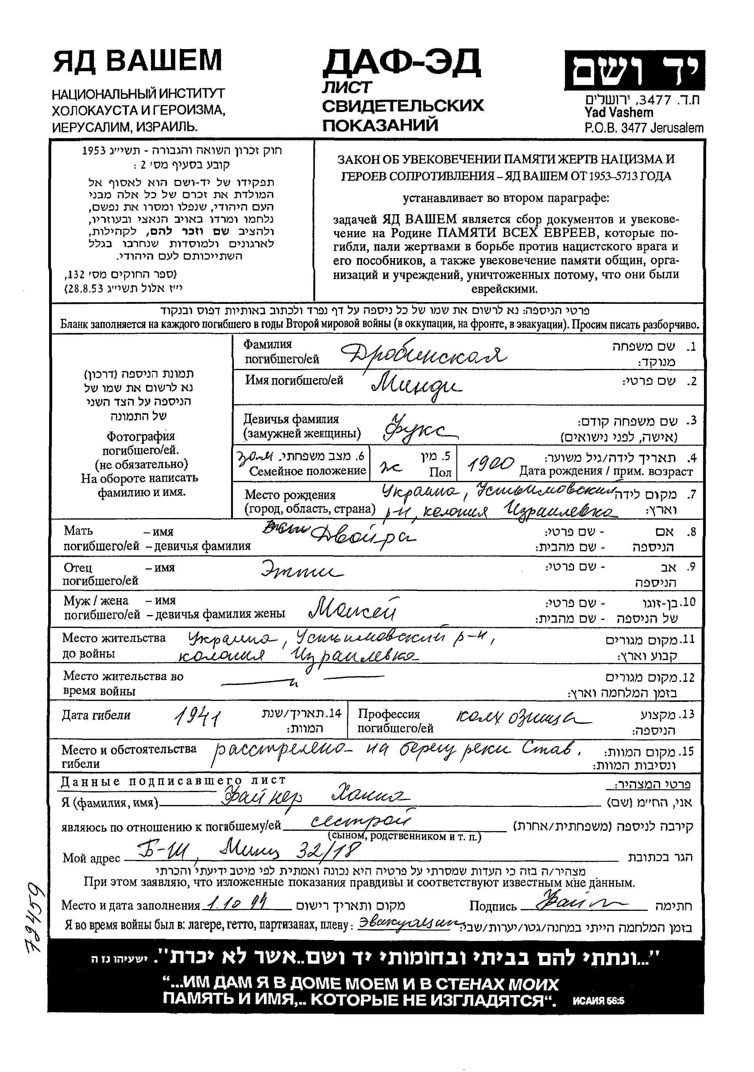 Mindi Drobinski, geb. Fuks wurde im Jahr 1900 in Izrailovka, Ukraine (UdSSR) geboren. Sie war die Tochter von Etti und Dvoira. Sie war Kolchosbauer/-bäuerin und mit Moisei Verheiratet. Vor dem Zweiten Weltkrieg lebte sie in Izrailovka, Ukraine (UdSSR). Während des Krieges war sie in Izrailovka, Ukraine (UdSSR).