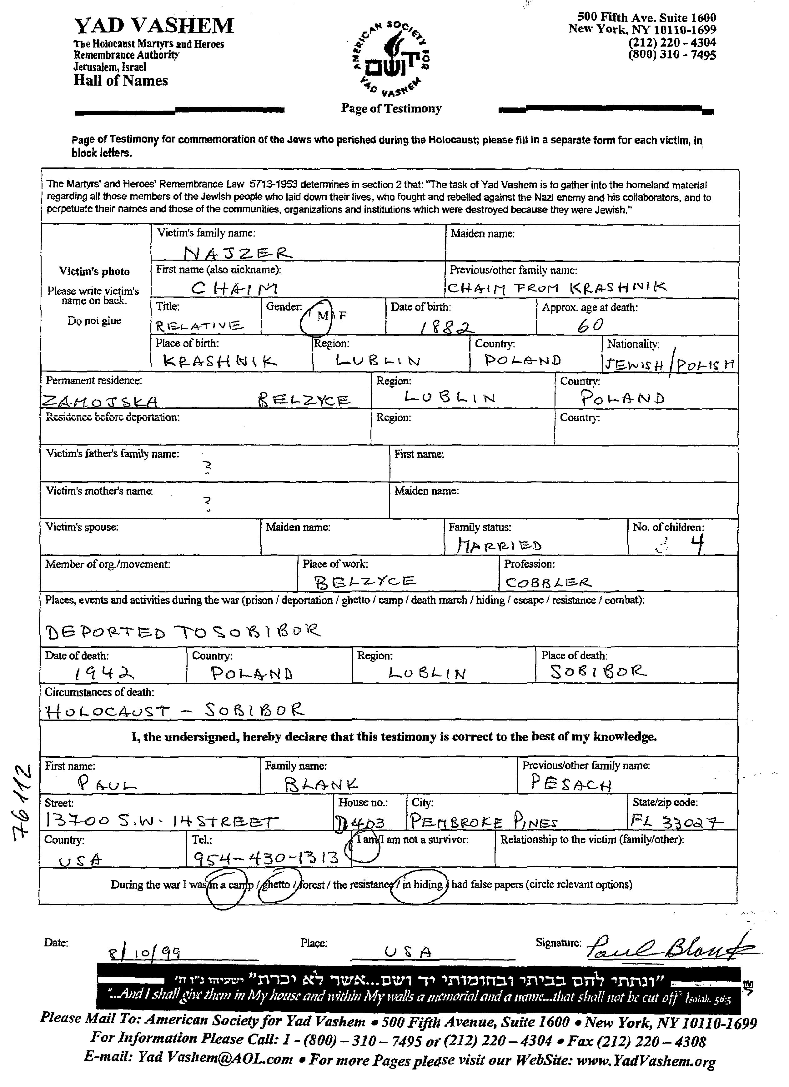 Chaim Najzer wurde im Jahr 1882 in Krashnik, Polen geboren. Er war Lederarbeiter/in und Verheiratet. Vor dem Zweiten Weltkrieg lebte er in Belzyce, Polen.