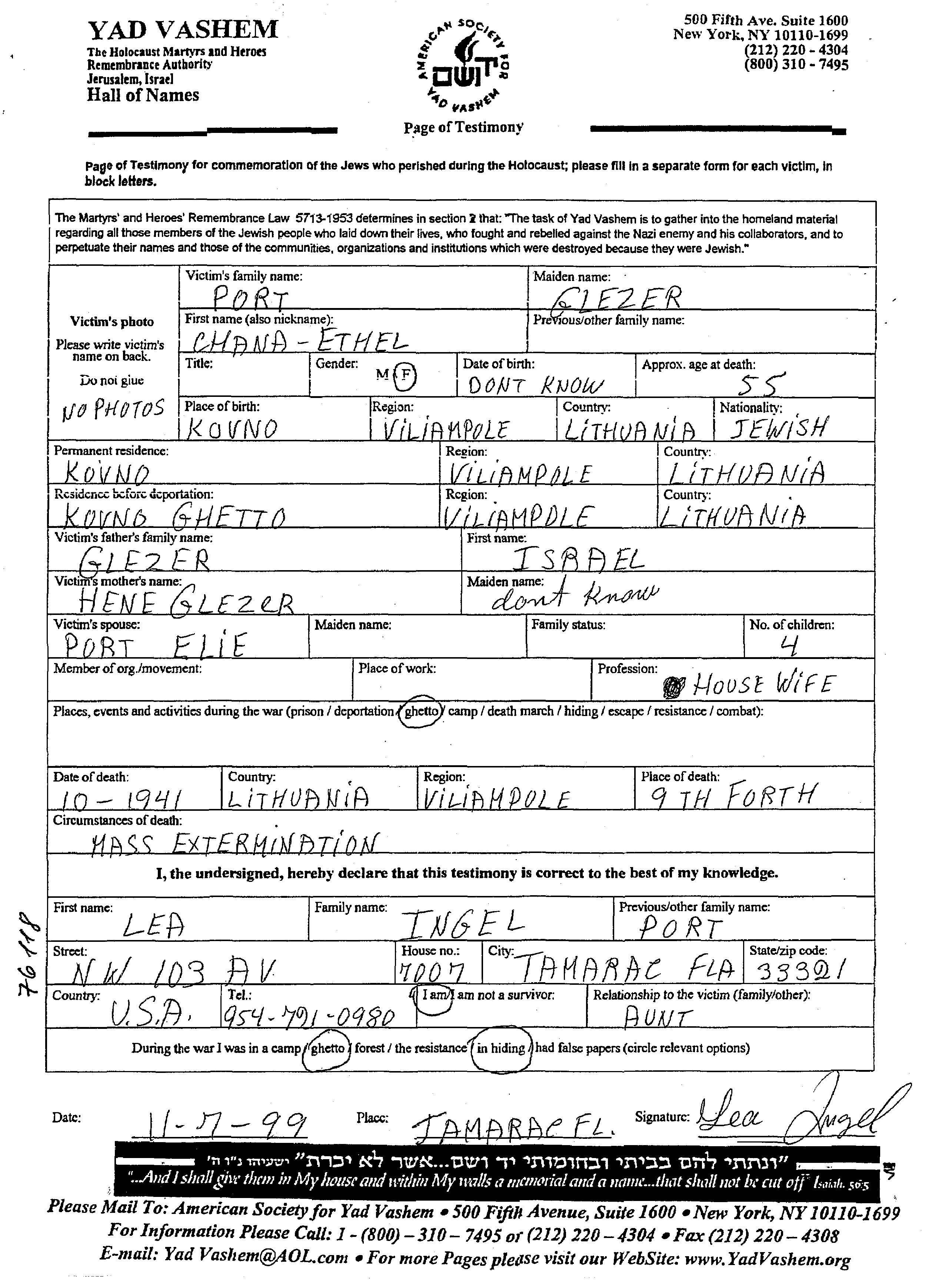 Chana Ethel Port Fort, geb. Glazer wurde in Kovno, Litauen geboren. Sie war die Tochter von Israel und Hene. Sie war Hausfrau. Vor dem Zweiten Weltkrieg lebte sie in Kovno, Litauen. Während des Krieges war sie in Kovno, Litauen.