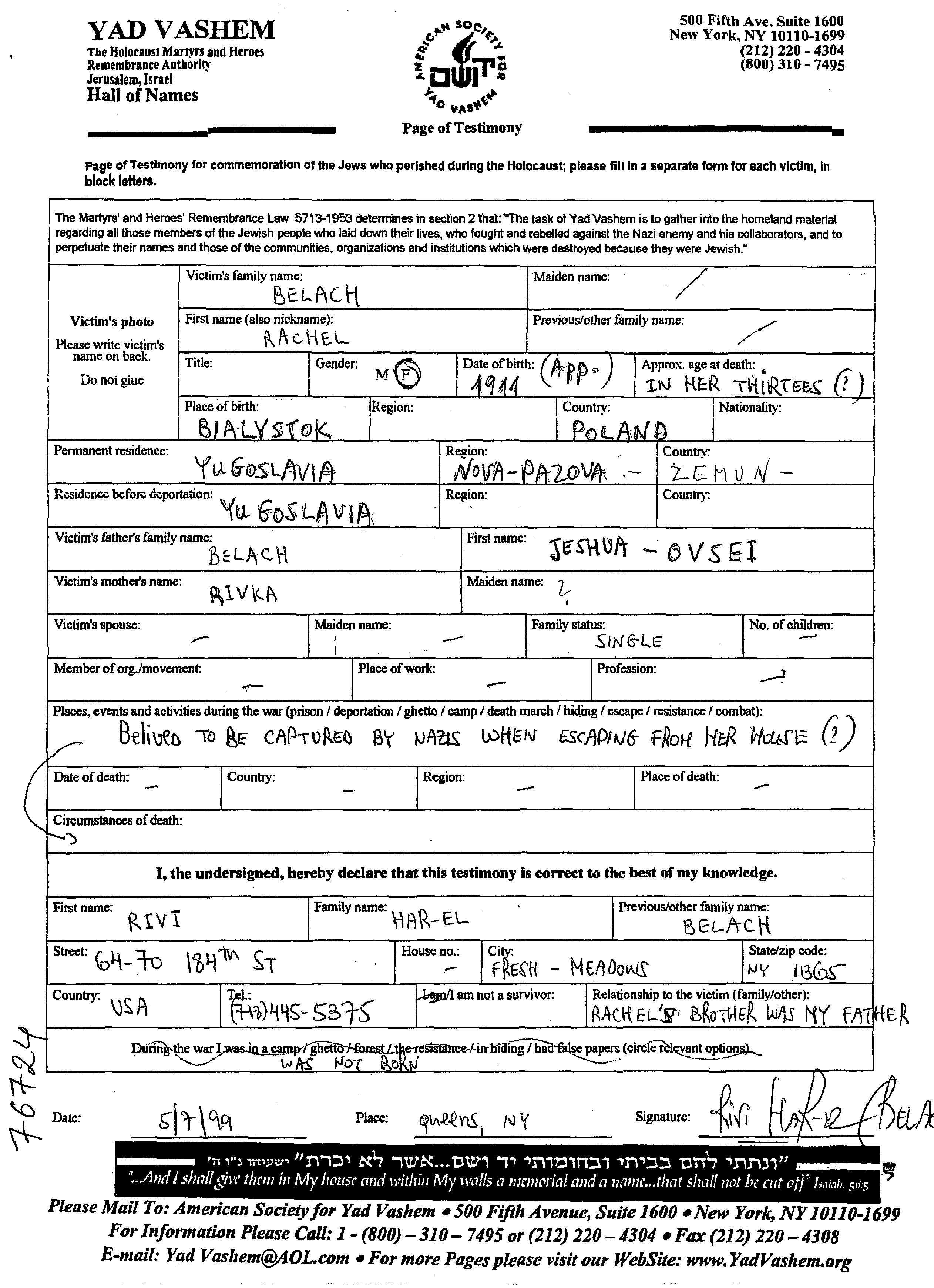 Rachel Belach wurde im Jahr 1911 in Bialystok, Polen geboren. Sie war die Tochter von Yehoshua Jeshua und Rivka. Sie war Ledig. Vor dem Zweiten Weltkrieg lebte sie in Zemun, Jugoslawien. Während des Krieges war sie in Jugoslawien.