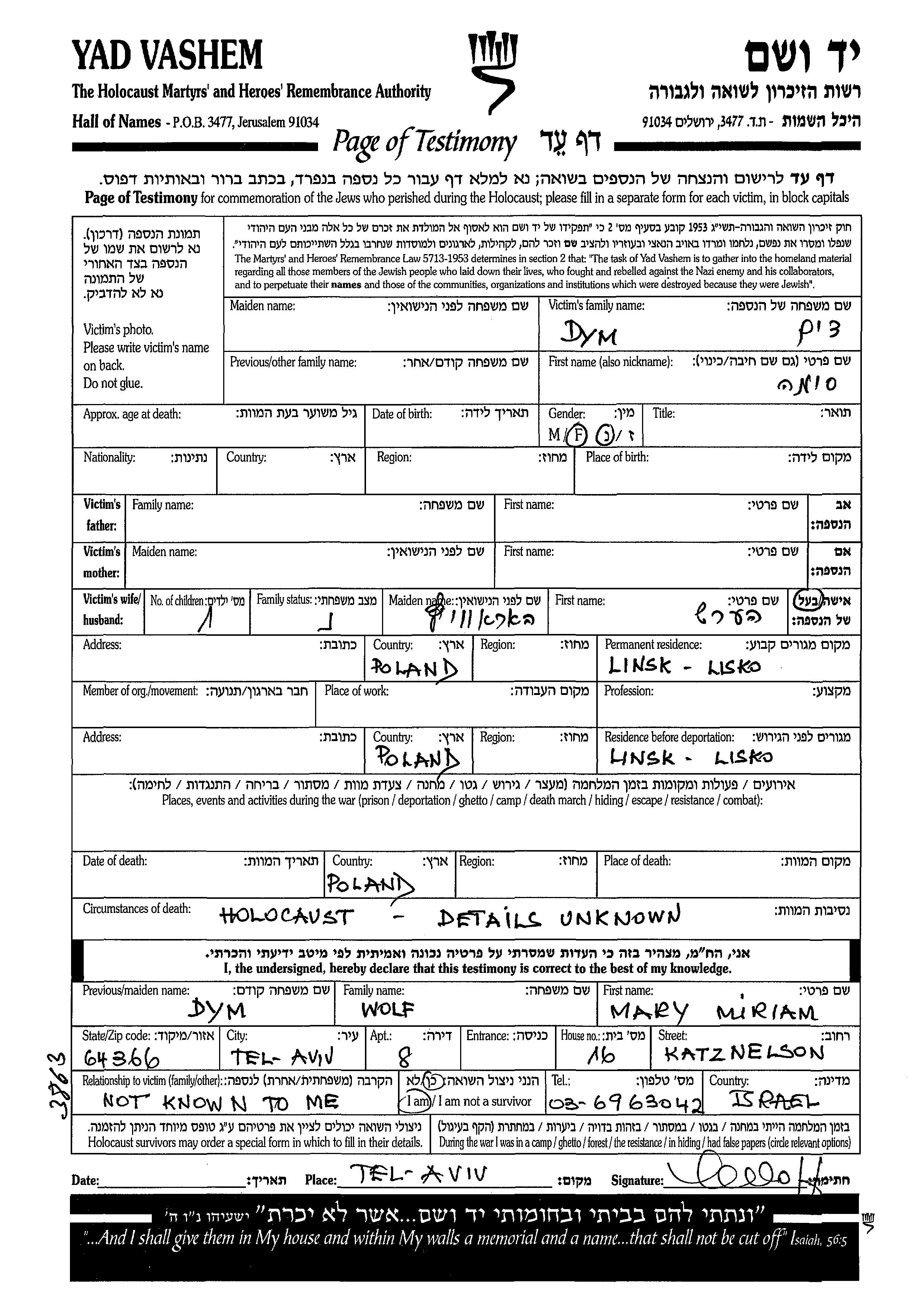 Sima Dym. Sie war mit Hersh, geb. Horovitz Verheiratet. Vor dem Zweiten Weltkrieg lebte sie in Linsk, Polen. Während des Krieges war sie in Linsk, Polen.