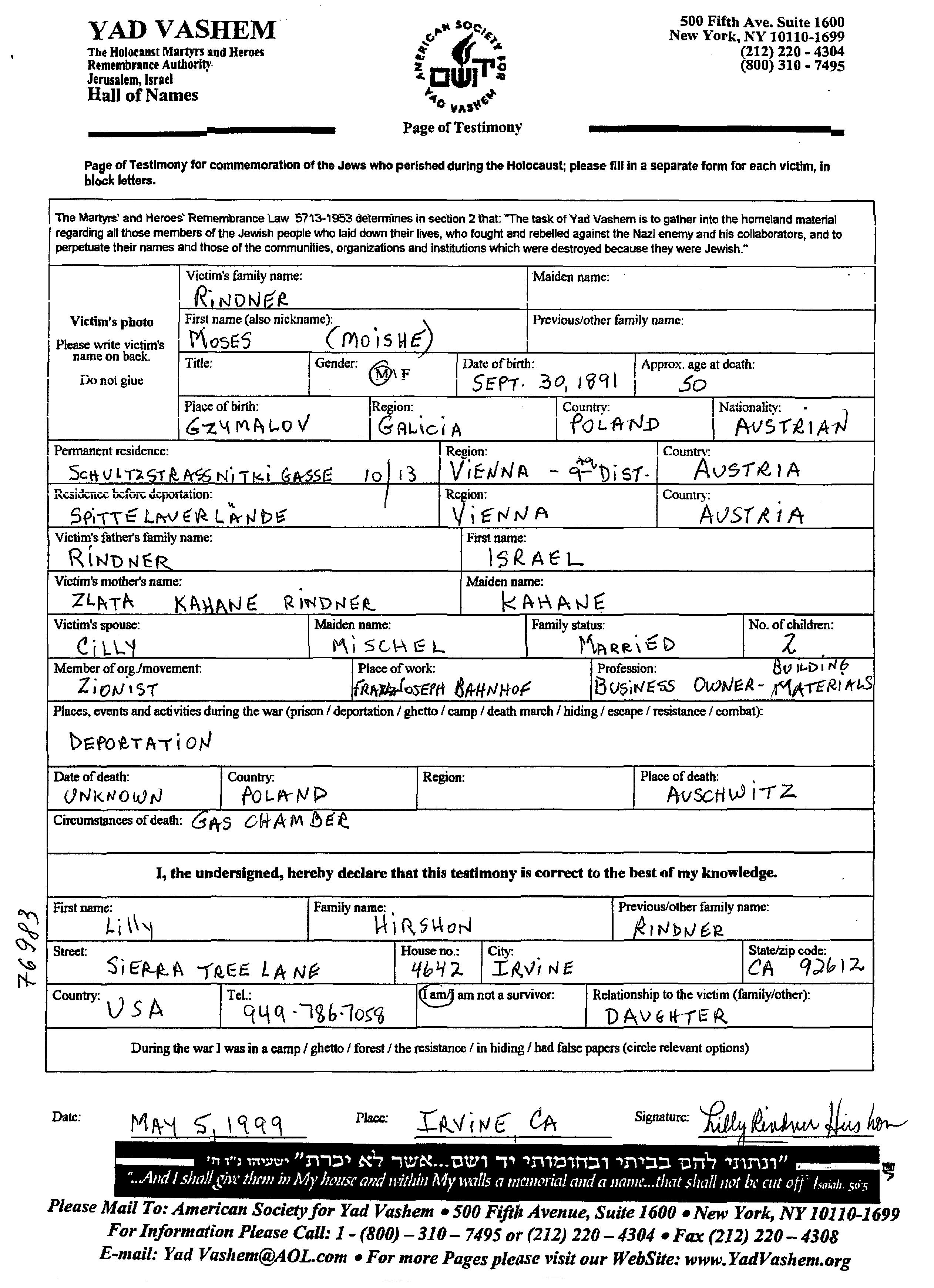 Moses Ridner wurde im Jahr 1891 in Grzymalow, Polen geboren. Er war der Sohn von Israel und Zlata. Er war Building materials business owner und mit Cilly, geb. Mischel Verheiratet. Vor dem Zweiten Weltkrieg lebte er in Vienna, Österreich. Während des Krieges war er in Vienna, Österreich.