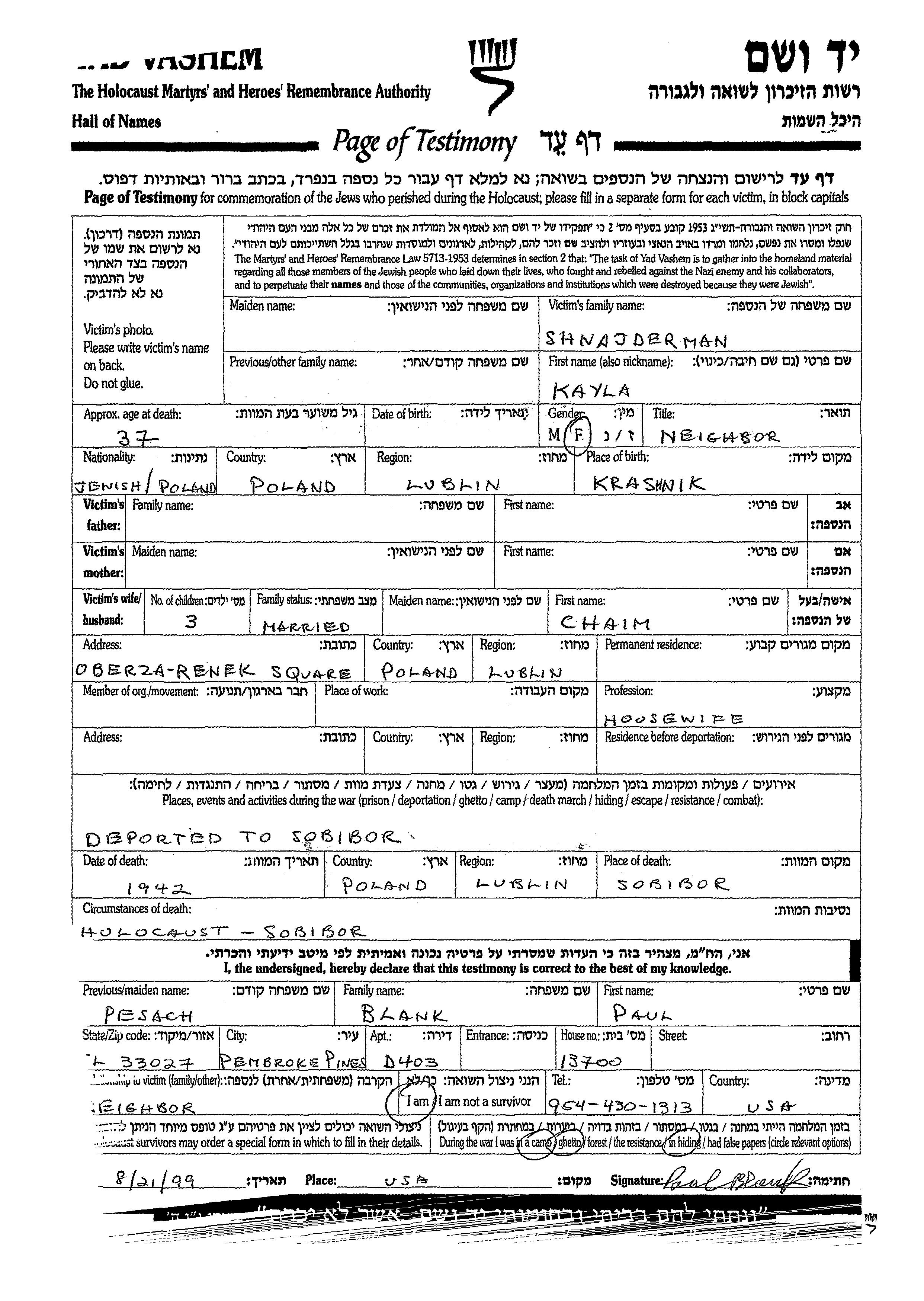 Kayla Shnajderman wurde in Krašnik, Polen geboren. Sie war Hausfrau und mit Chaim Verheiratet. Vor dem Zweiten Weltkrieg lebte sie in Krašnik, Polen.