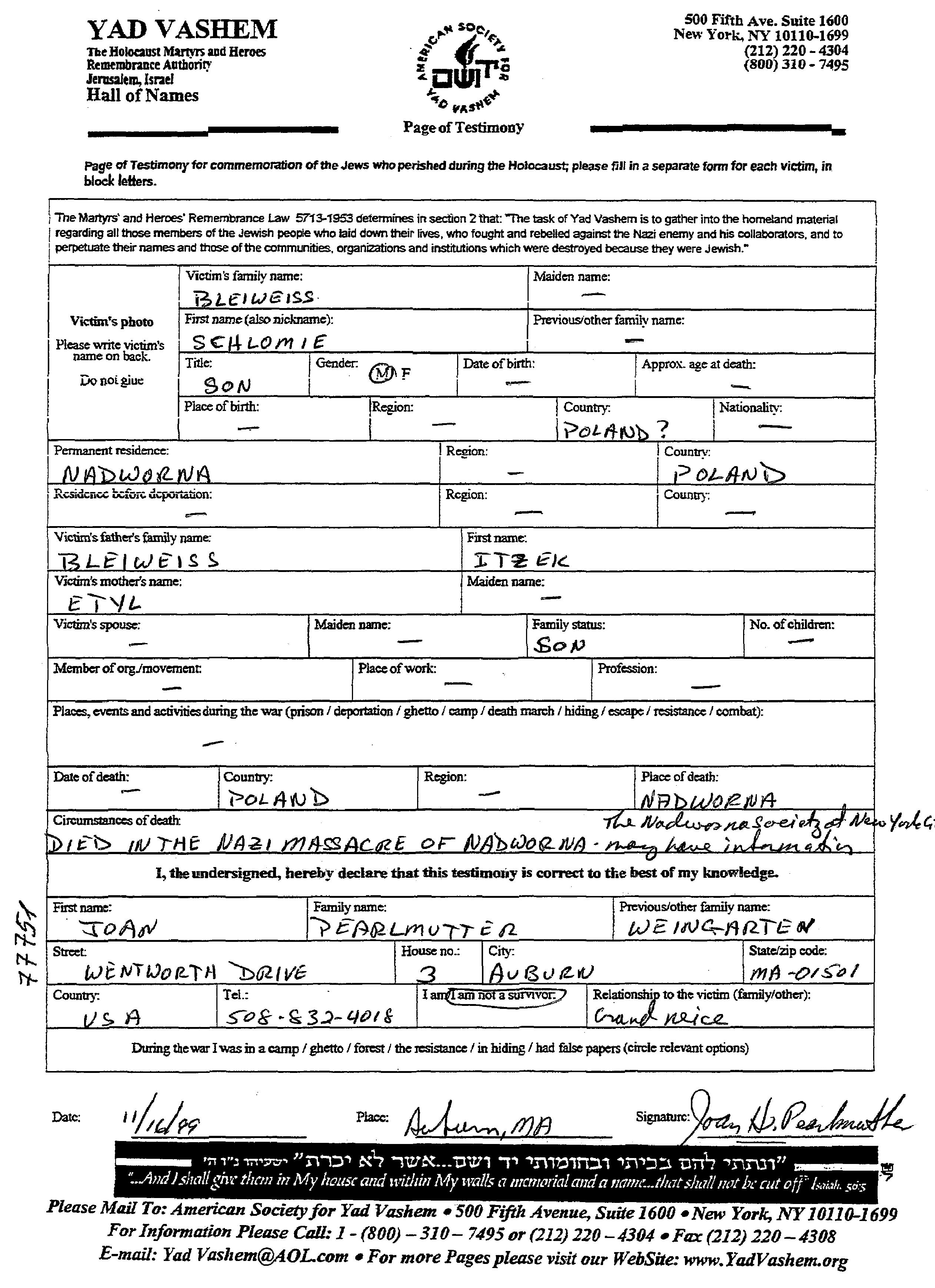 Bleiweiss Schlomie Nadworna, Polen Gedenkblatt