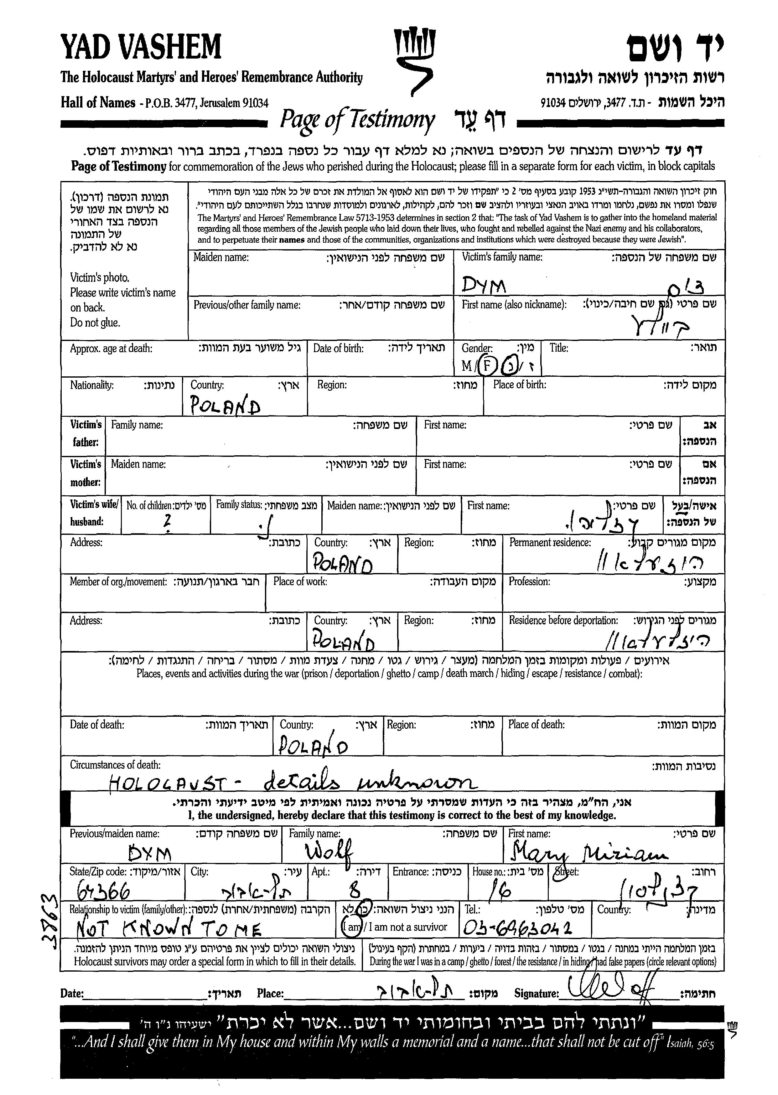 Beile Dym wurde in Polen geboren. Sie war mit Gdaliyahu Verheiratet. Vor dem Zweiten Weltkrieg lebte sie in Chorzelow, Polen. Während des Krieges war sie in Chorzelow, Polen.