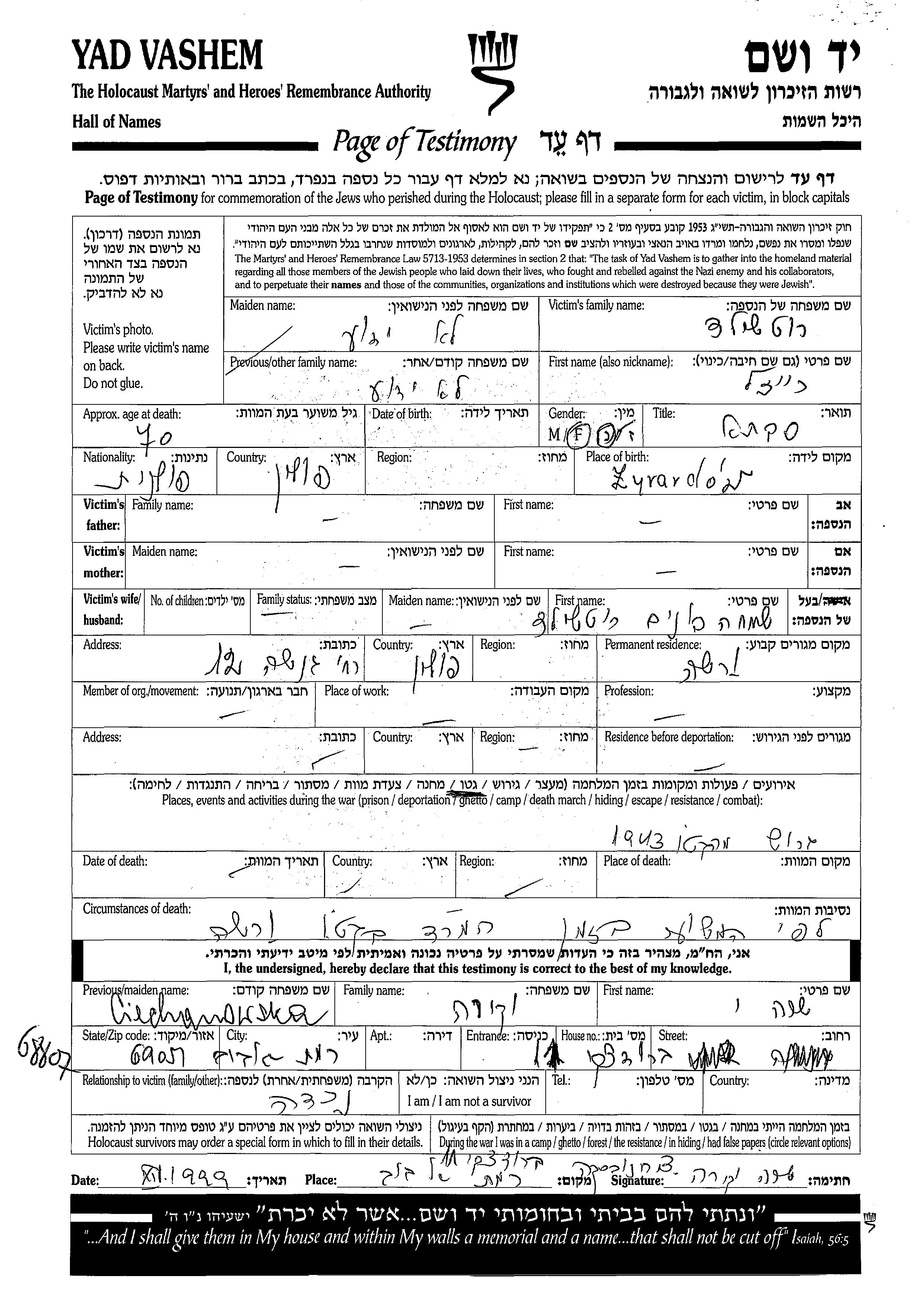 Reizl wurde in der Schoah ermordet. Todesort: Warszawa, Polen im Jahr 1943.