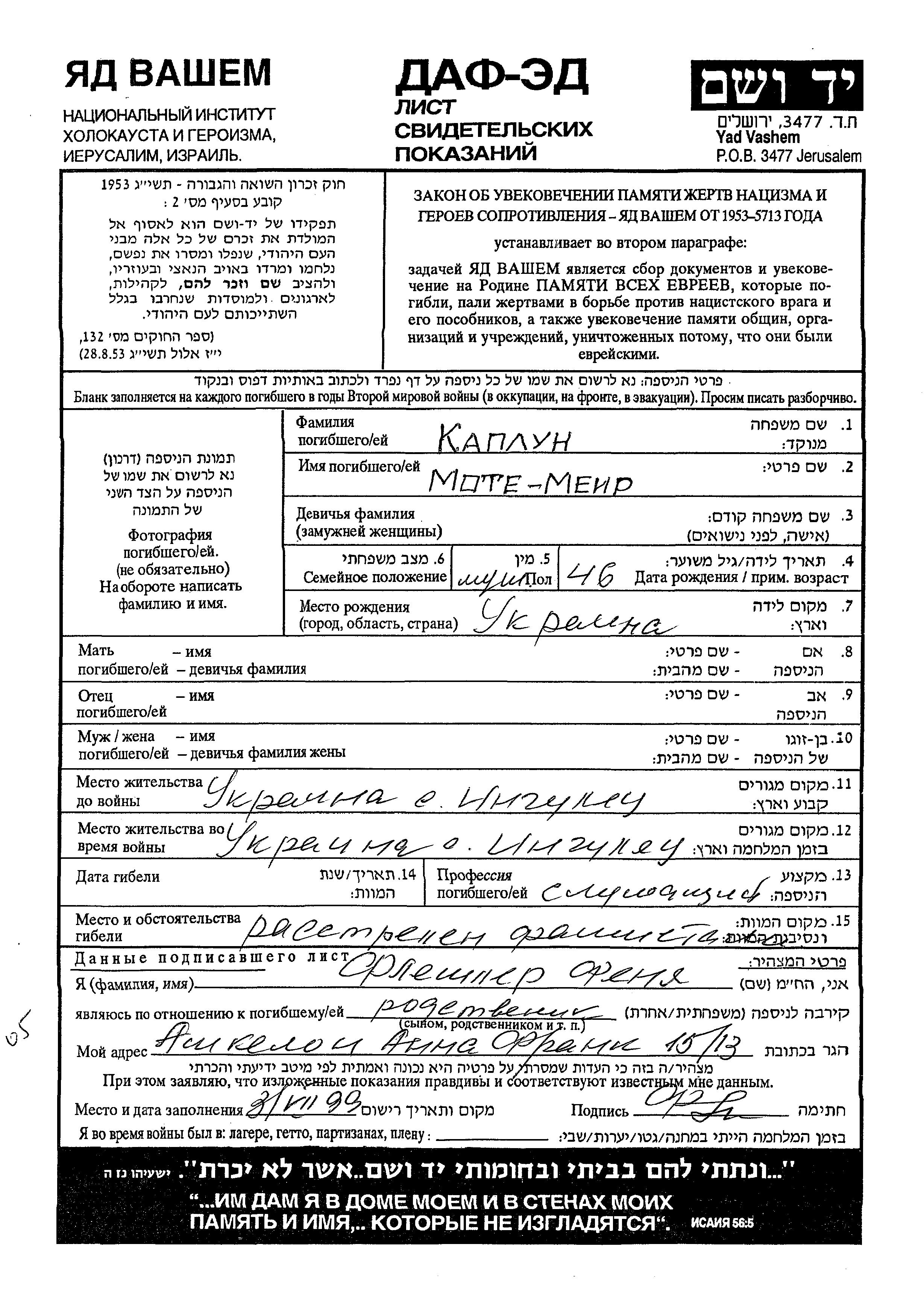 Mote Meir Kaplun wurde in Ukraine (UdSSR) geboren. Er war Angestellte/-r. Vor dem Zweiten Weltkrieg lebte er in Ingulets, Ukraine (UdSSR). Während des Krieges war er in Ingulets, Ukraine (UdSSR).