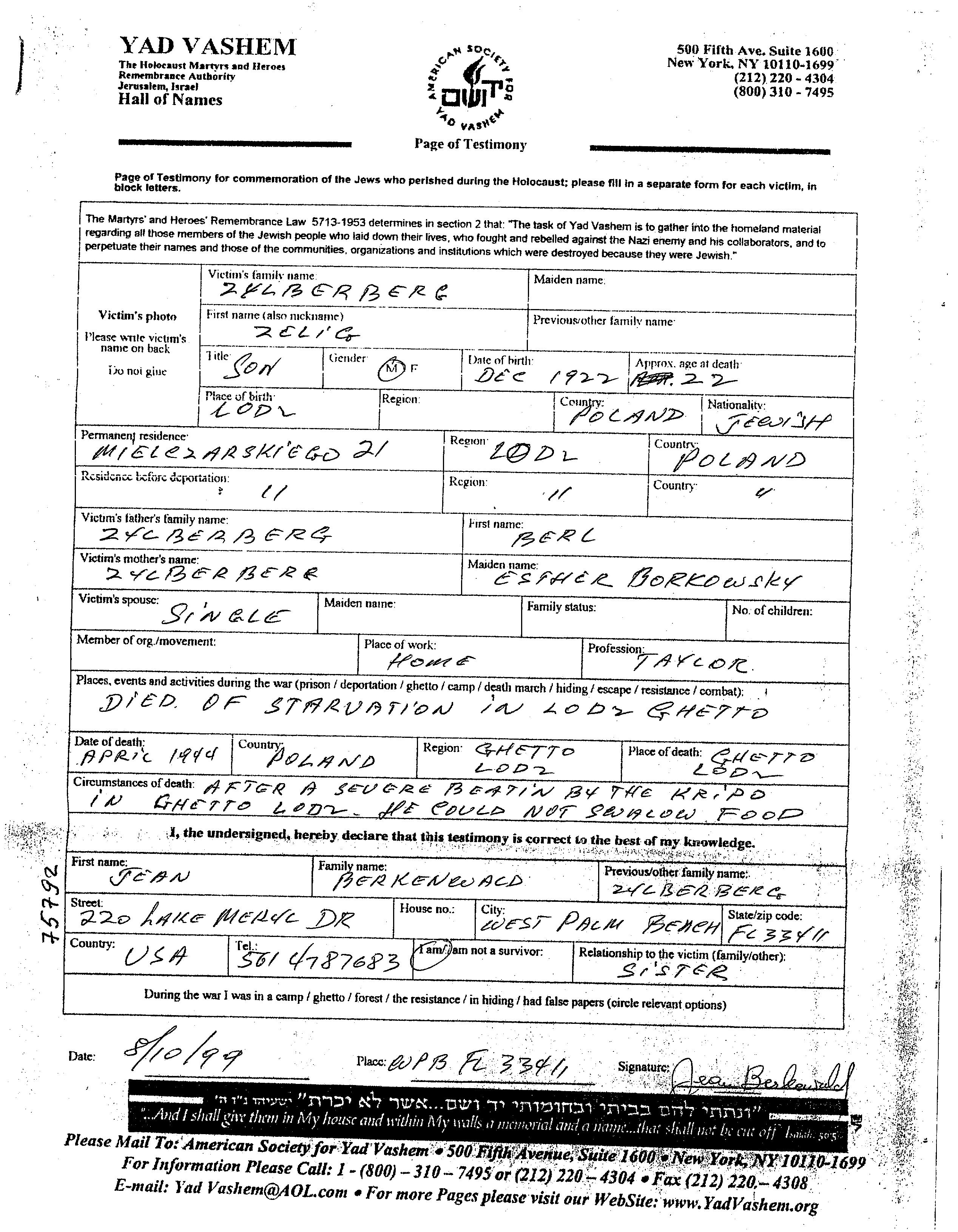Zelig Zylberberg wurde im Jahr 1922 in Lodz, Polen geboren. Er war der Sohn von Berl und Ester. Er war Schneider und Ledig. Vor dem Zweiten Weltkrieg lebte er in Lodz, Polen. Während des Krieges war er in Lodz, Polen.