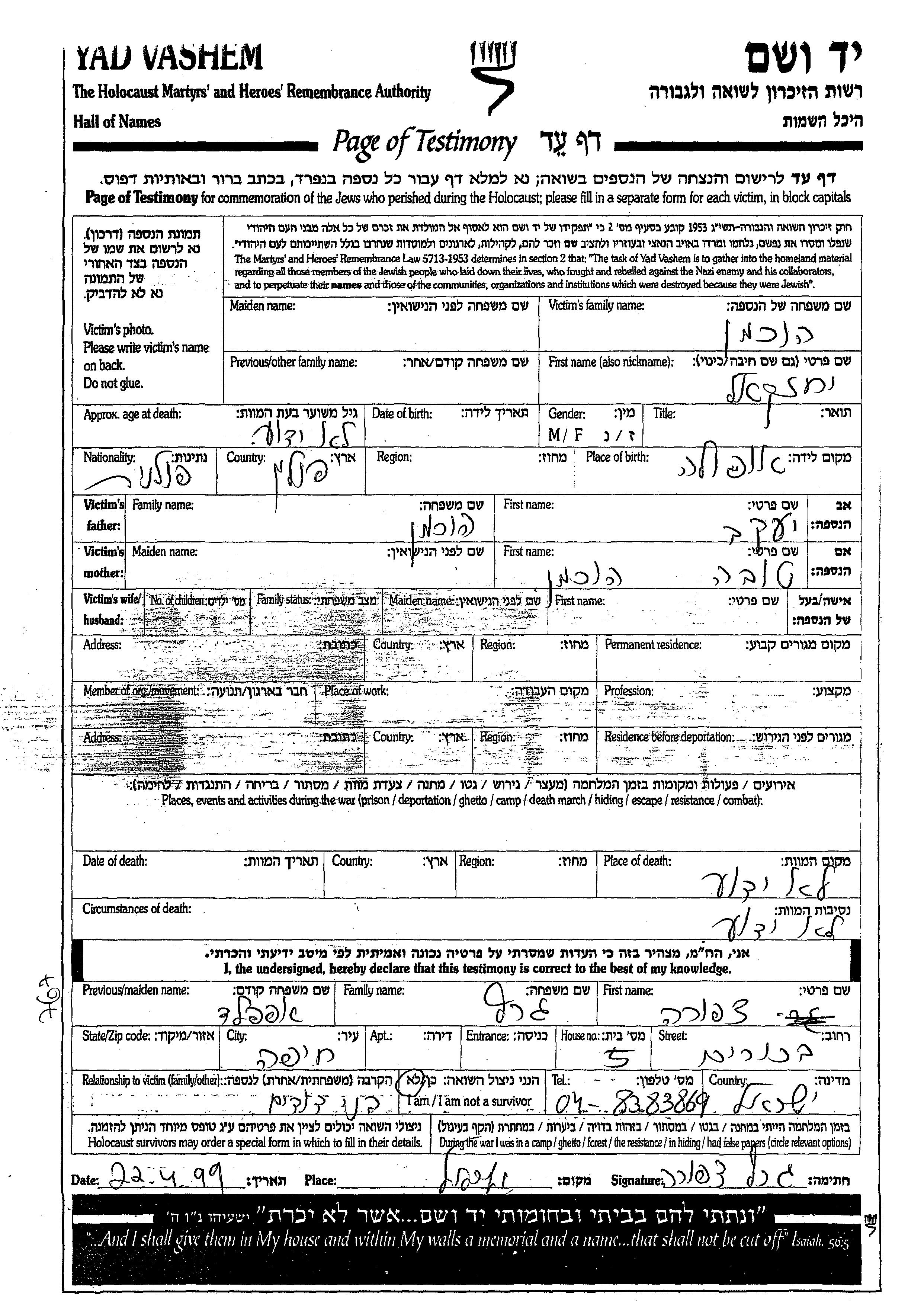 Hokhman Yekhezkel unbekannter Ort, Gedenkblatt