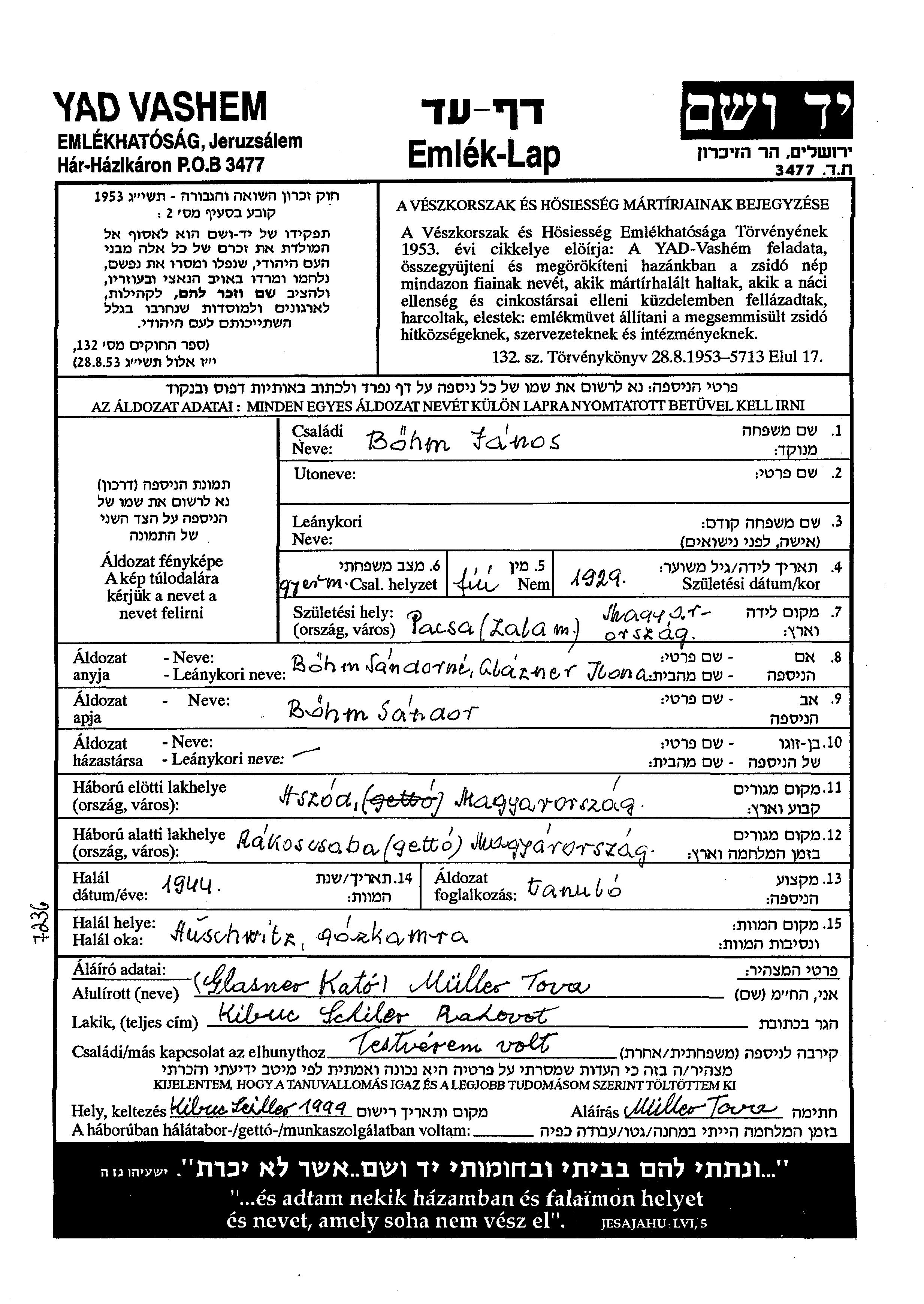 Janos Bohm wurde im Jahr 1929 in Pacsa, Ungarn geboren. Er war der Sohn von Sandor und Ilona. Er war Schüler/-in und Kind. Vor dem Zweiten Weltkrieg lebte er in Ungarn. Während des Krieges war er in Rakoscsaba, Ungarn.