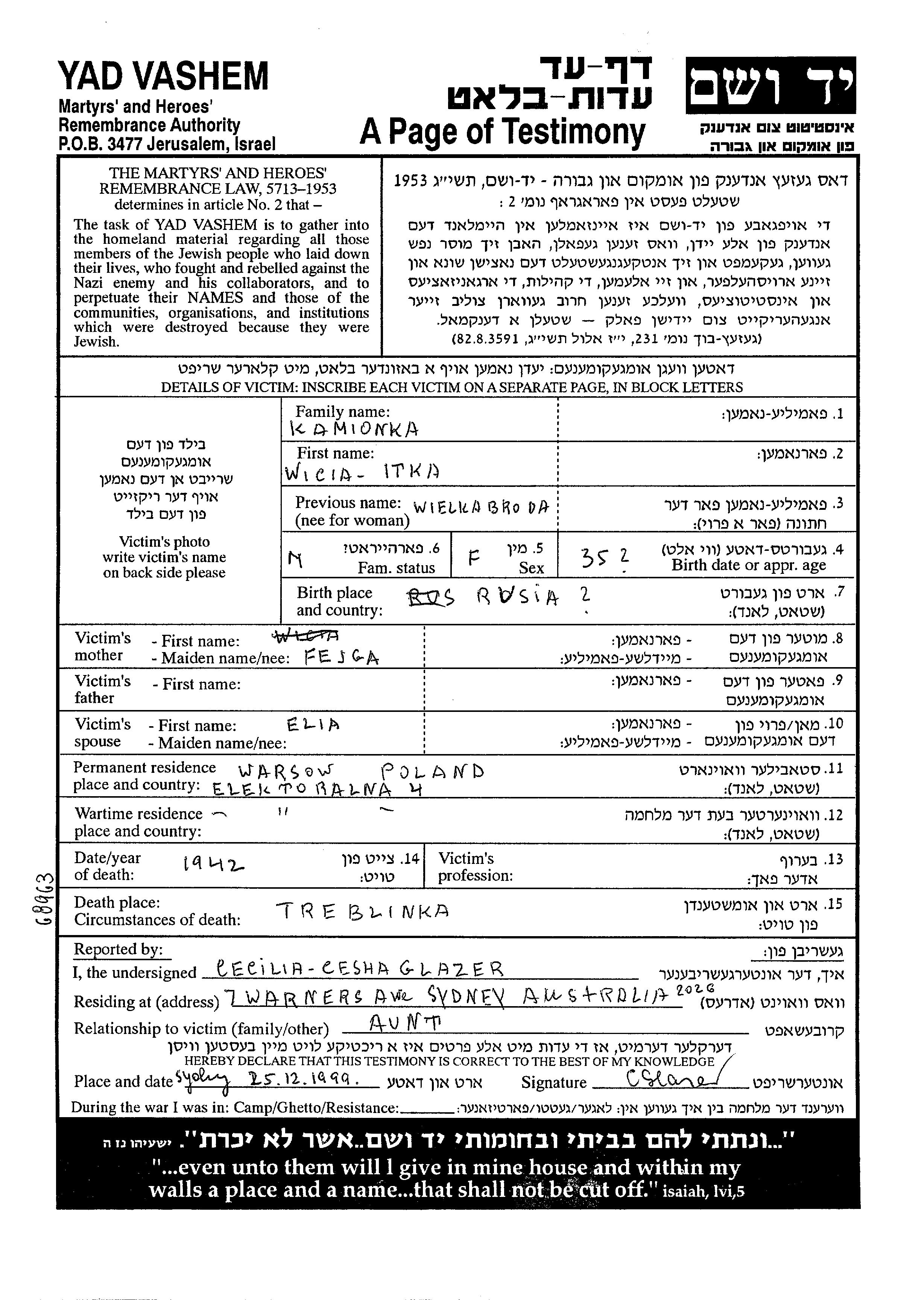 Wicia Itka Kamionka, geb. Wielkabroda wurde in Russland (UdSSR) geboren. Sie war die Tochter von Fejga. Sie war mit Elia Verheiratet. Vor dem Zweiten Weltkrieg lebte sie in Warszawa, Polen. Während des Krieges war sie in Warszawa, Polen.