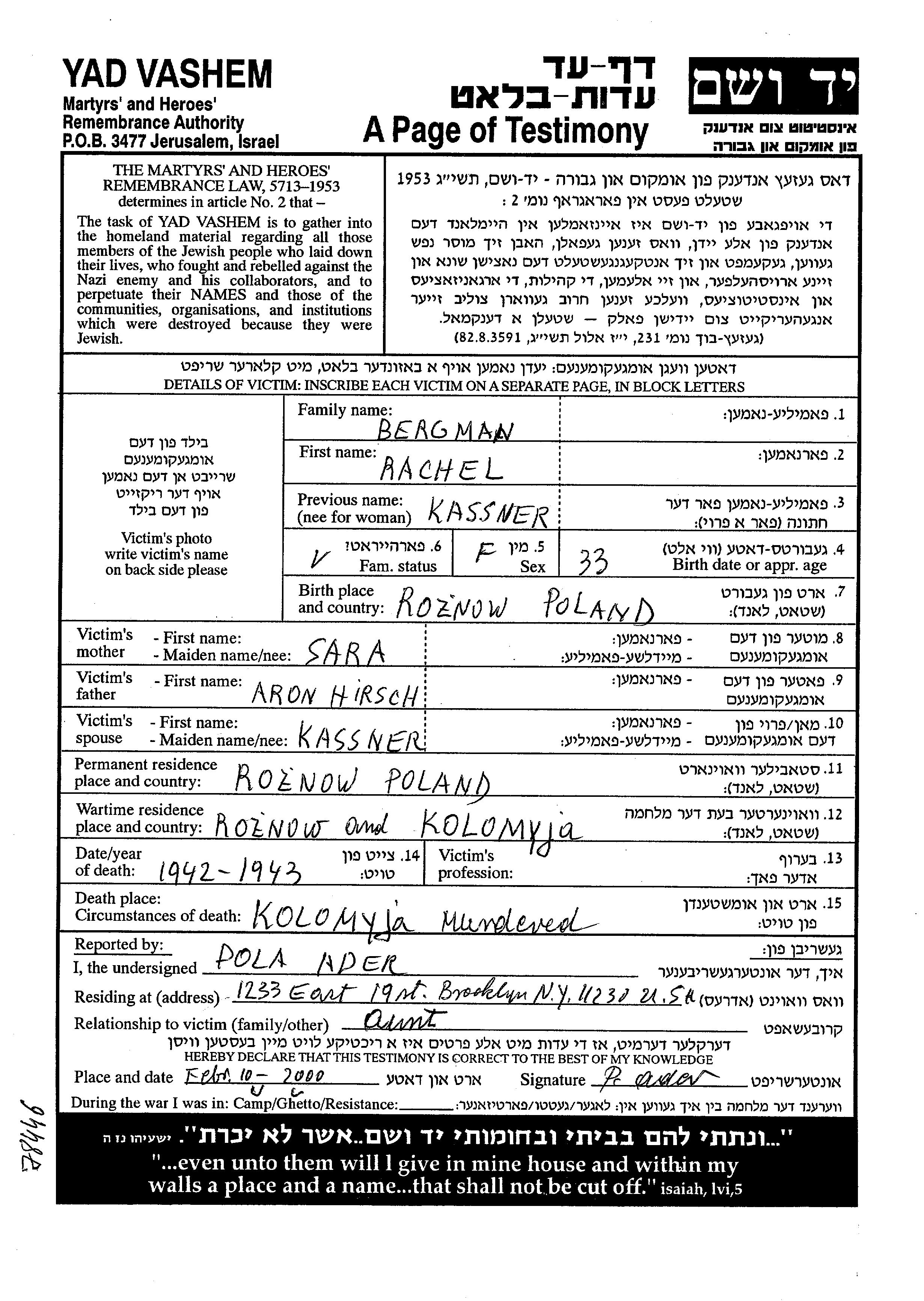 Rachel Bergman, geb. Kassner wurde in Roznow, Polen geboren. Sie war die Tochter von Aron Hirsch und Sara. Vor dem Zweiten Weltkrieg lebte sie in Roznow, Polen. Während des Krieges war sie in Kolomyja, Polen.