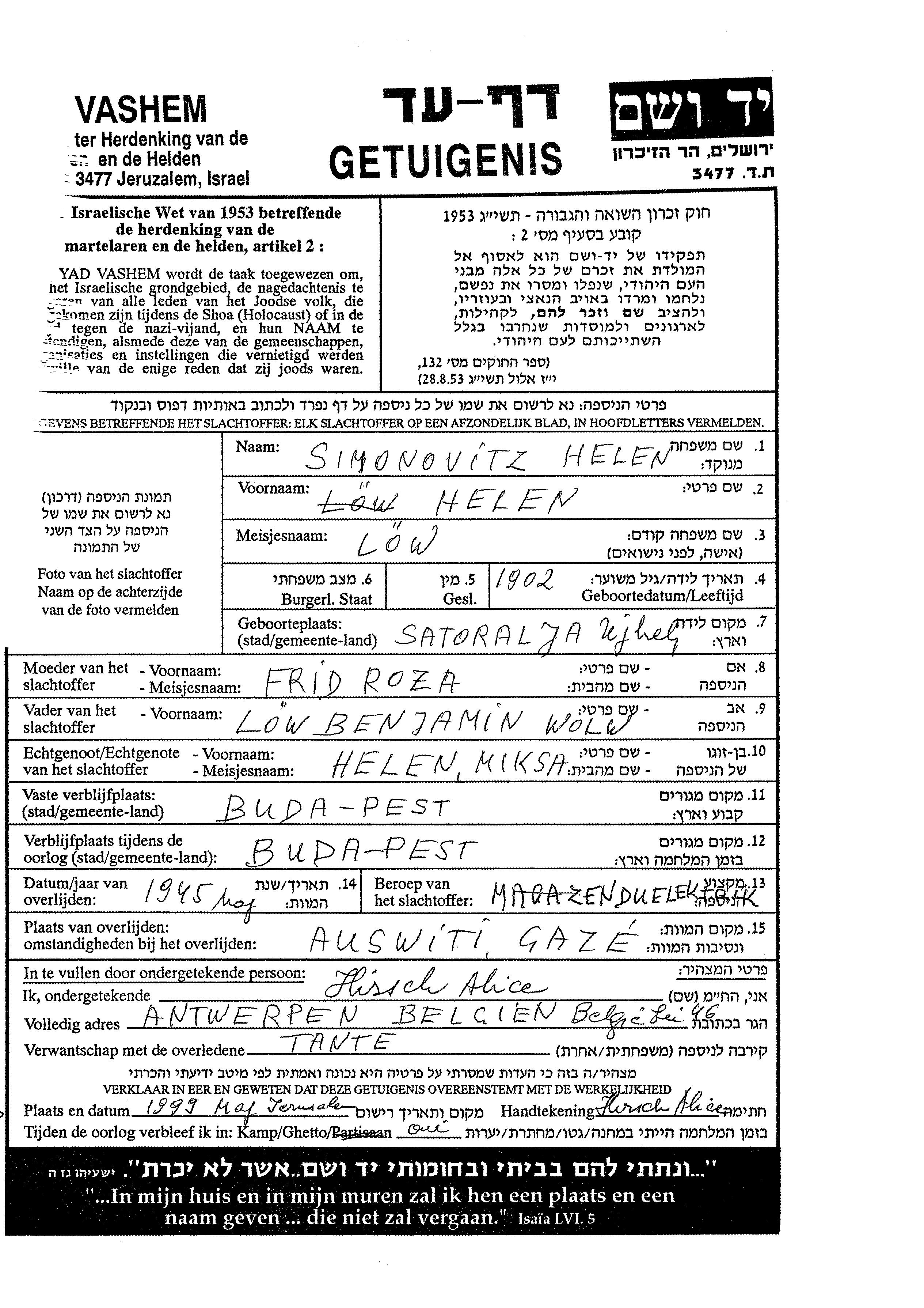 Helen Simonovitz, geb. Löw wurde im Jahr 1902 in Satoraljaujhely, Ungarn geboren. Sie war die Tochter von Benjamin Wolw und Roza. Sie war mit Miksa Verheiratet. Vor dem Zweiten Weltkrieg lebte sie in Budapest, Ungarn. Während des Krieges war sie in Budapest, Ungarn.