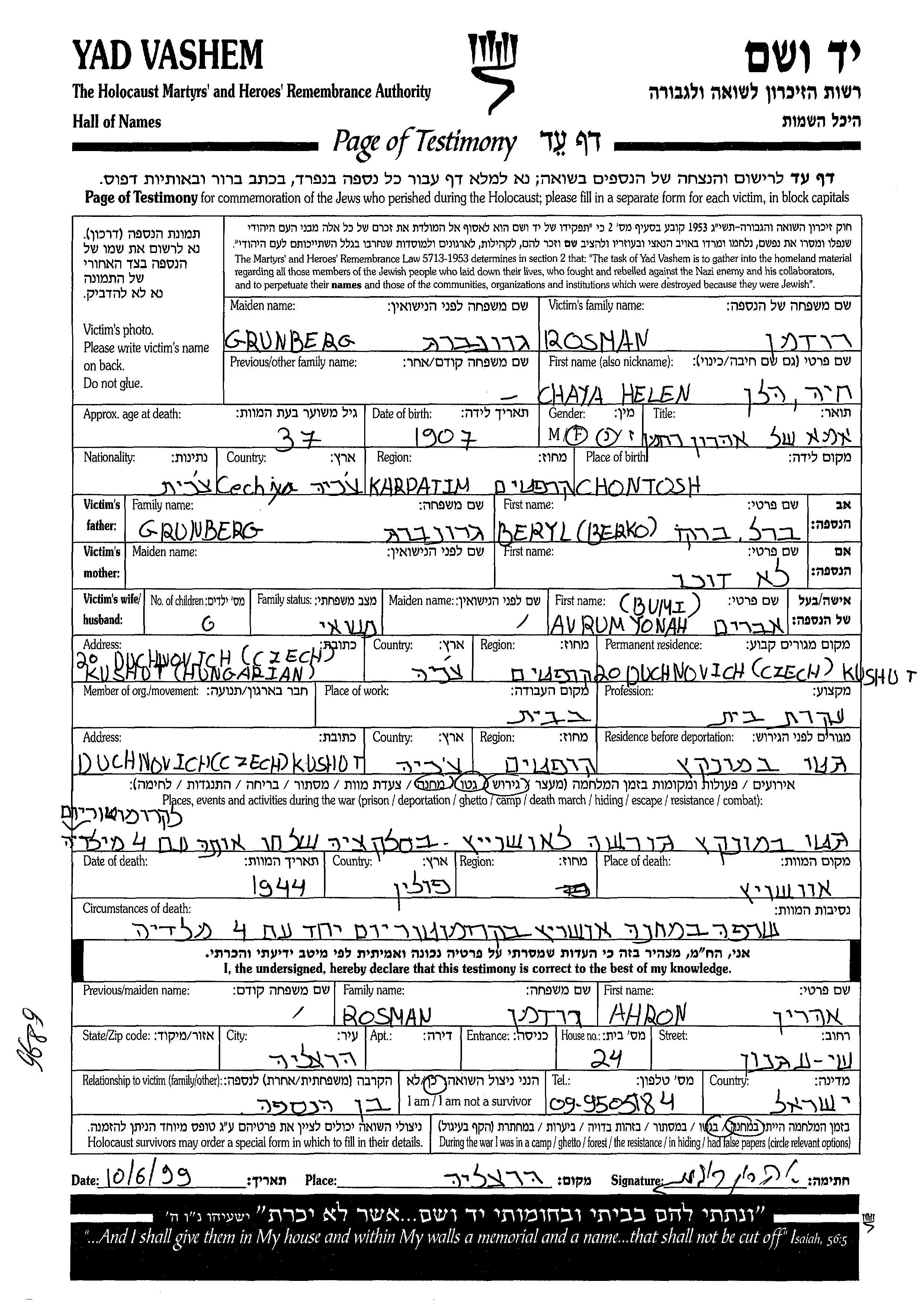Chaya Helen Rosman Rozman, geb. Grunberg wurde im Jahr 1907 in Csontos, Tschechoslowakei geboren. Sie war die Tochter von Beryl. Sie war Hausfrau und mit Avrum Yonah Verheiratet. Vor dem Zweiten Weltkrieg lebte sie in Dunkovica, Tschechoslowakei. Während des Krieges war sie in Mukacevo, Tschechoslowakei.