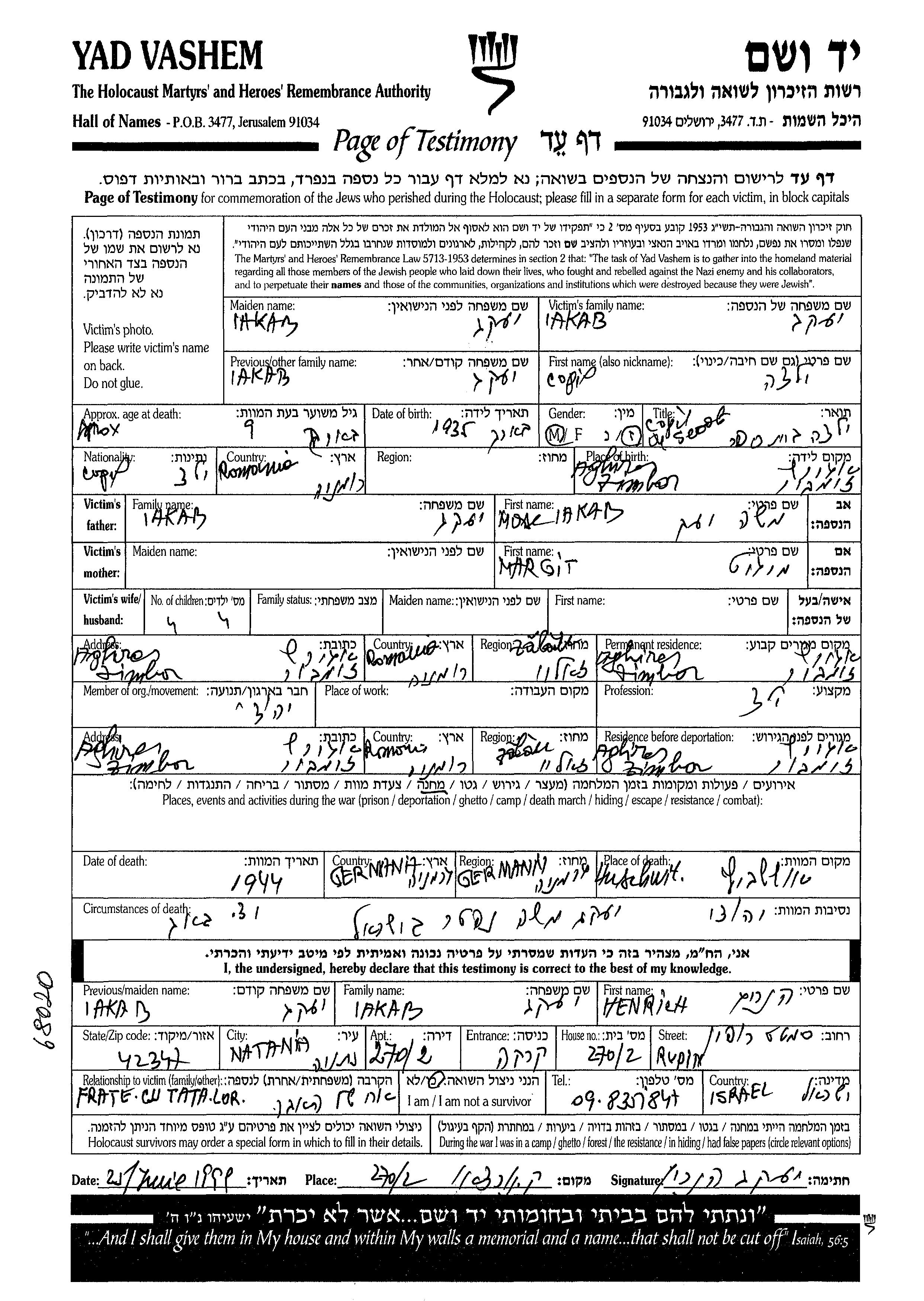 Vorname unbekannt Iakab wurde im Jahr 1935 in Aghires, Rumänien geboren. Er war der Sohn von Mose und Margit. Er war Schüler/-in und Kind. Vor dem Zweiten Weltkrieg lebte er in Aghires, Rumänien. Während des Krieges war er in Aghires, Rumänien.