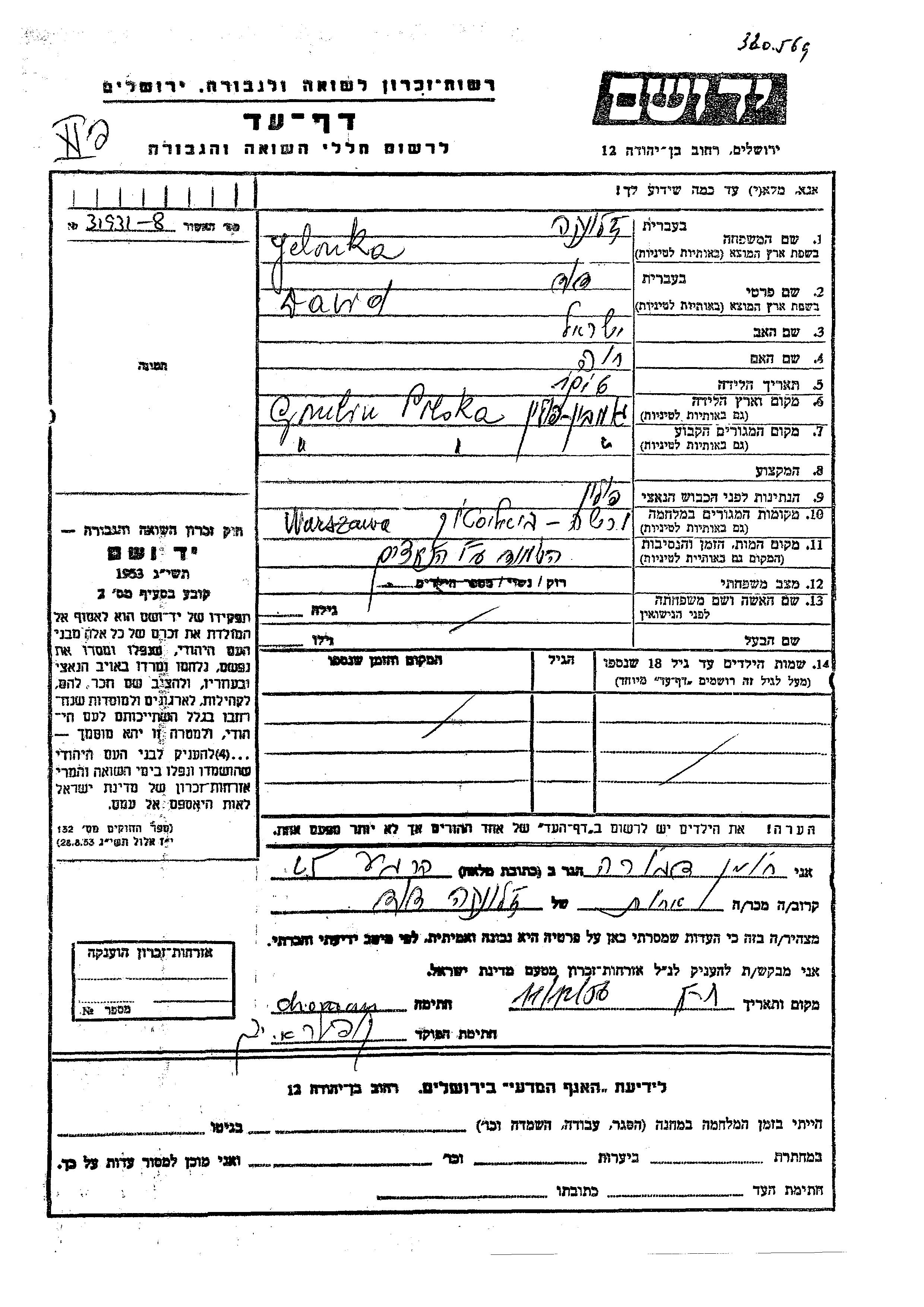 Dawid Zelonka wurde im Jahr 1916 in Gombin, Polen geboren. Er war der Sohn von Yisrael und Khava. Er war Ledig. Vor dem Zweiten Weltkrieg lebte er in Gombin, Polen. Während des Krieges war er in Warszawa, Polen.