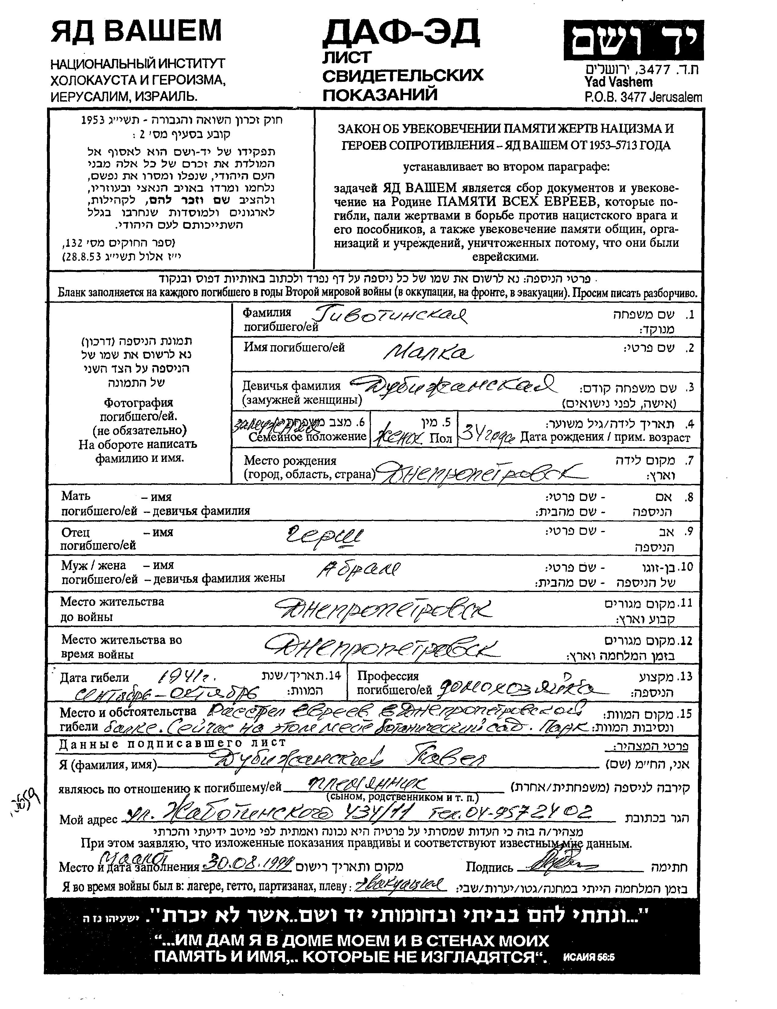 Malka Dubizhanskaya, geb. Givotinskaya wurde in Dnepropetrovsk, Ukraine (UdSSR) geboren. Sie war die Tochter von Gersh und Abram. Sie war Hausfrau und Verheiratet. Vor dem Zweiten Weltkrieg lebte sie in Dnepropetrovsk, Ukraine (UdSSR). Während des Krieges war sie in Dnepropetrovsk, Ukraine (UdSSR).