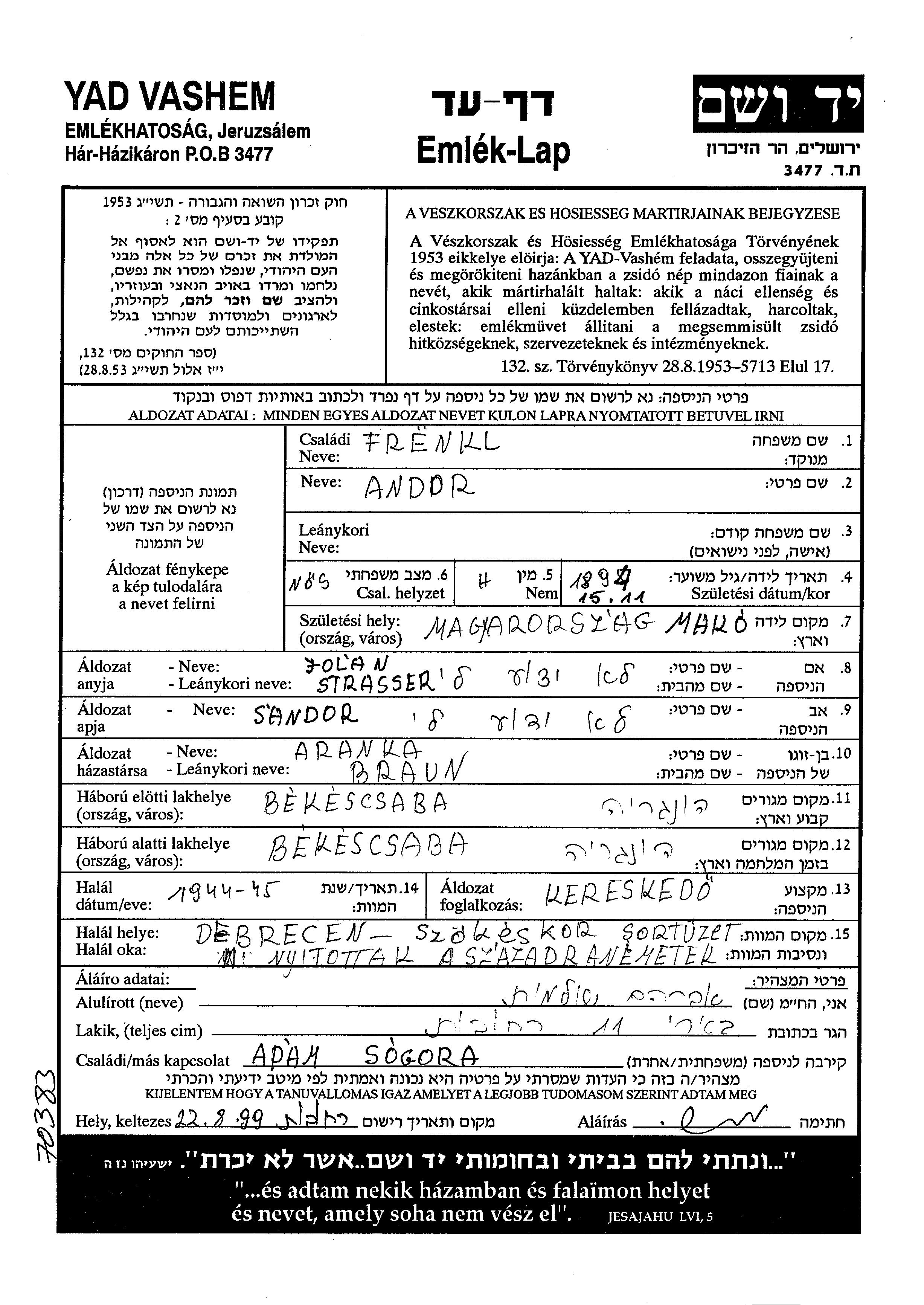 Andor Frenkl wurde im Jahr 1894 in Mako, Ungarn geboren. Er war der Sohn von Sandor und Jolan. Er war Kaufmann/-frau und mit Aranka, geb. Braun Verheiratet. Vor dem Zweiten Weltkrieg lebte er in Békéscsaba, Ungarn. Während des Krieges war er in Békéscsaba, Ungarn.