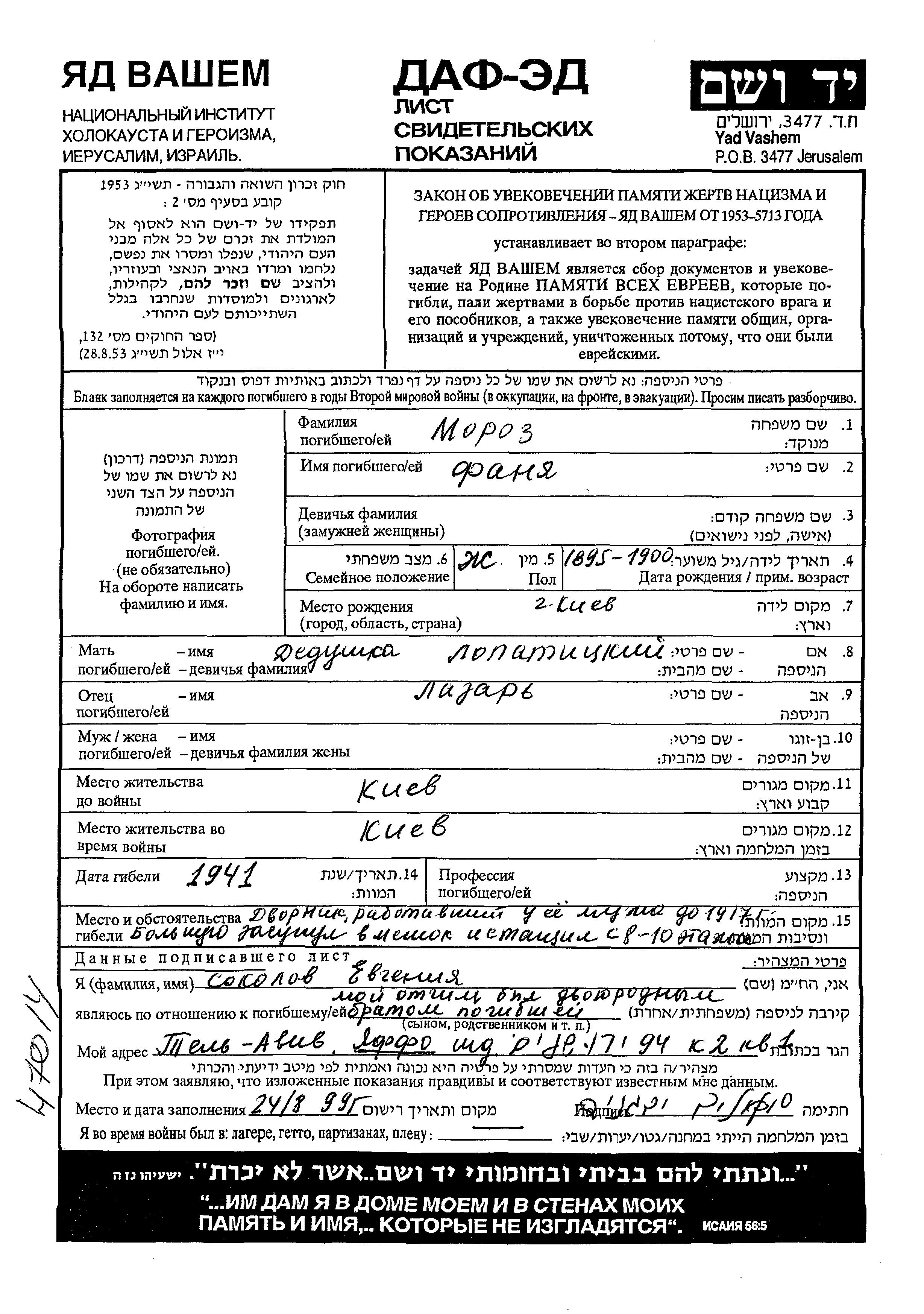 Fanya Moroz wurde im Jahr 1895 in Kiev, Ukraine (UdSSR) geboren. Sie war die Tochter von Lazar. Vor dem Zweiten Weltkrieg lebte sie in Kiev, Ukraine (UdSSR). Während des Krieges war sie in Kiev, Ukraine (UdSSR).