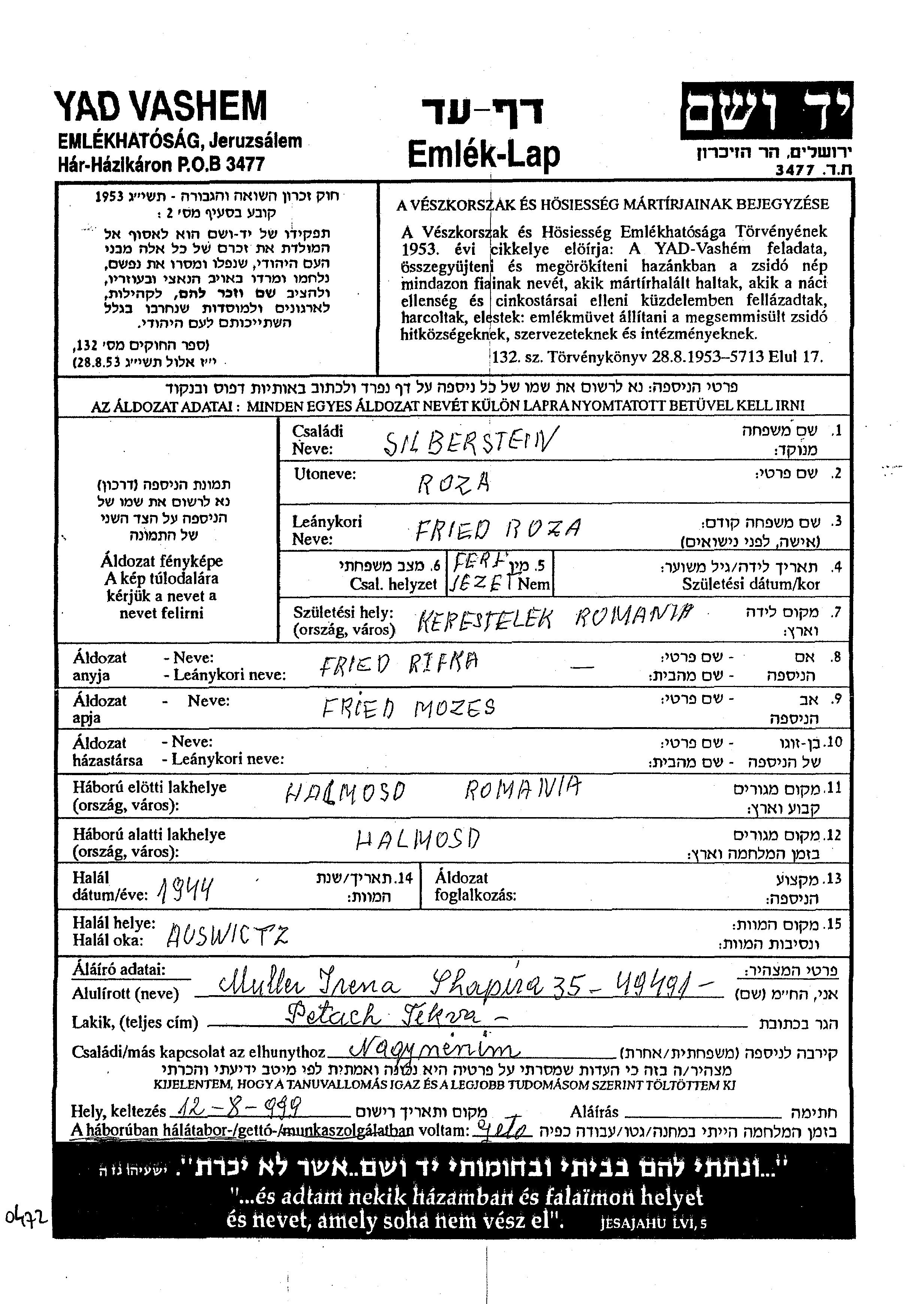 Roza Silberstein, geb. Fried wurde in Kerestelek, Rumänien geboren. Sie war die Tochter von Moshe und Rivka. Vor dem Zweiten Weltkrieg lebte sie in Halmosd, Rumänien. Während des Krieges war sie in Halmosd, Rumänien.