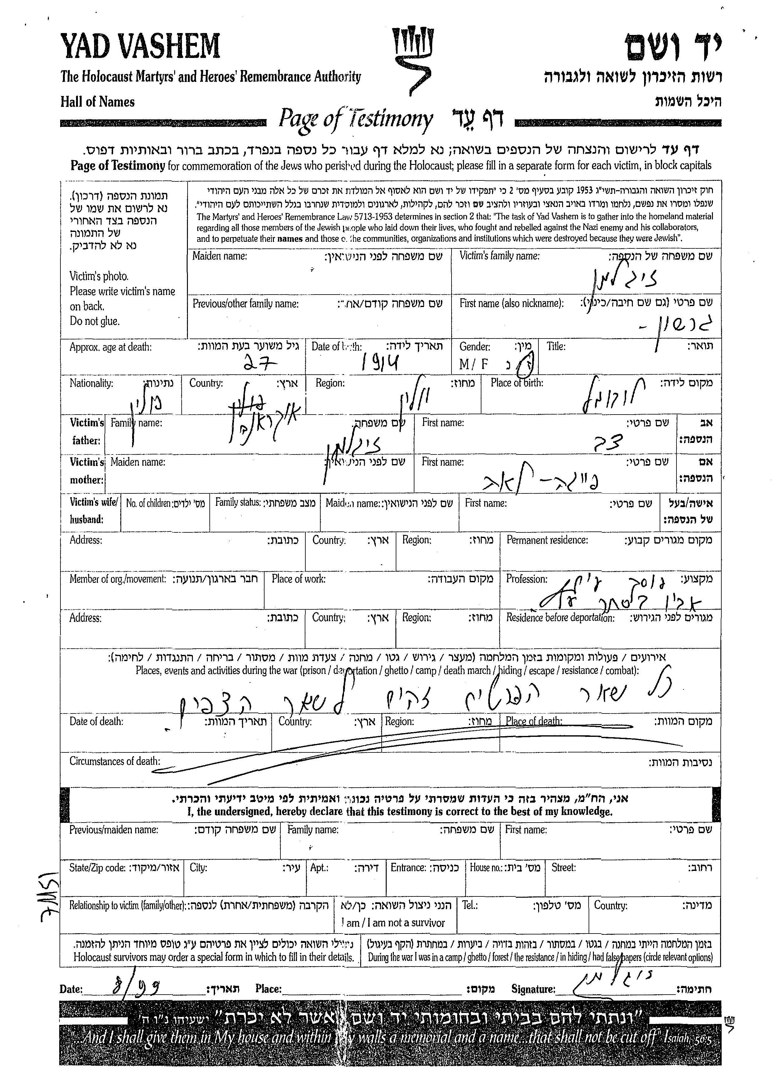 Gershon Zigelman wurde im Jahr 1914 in Lubomil, Polen geboren. Er war der Sohn von Dov und Feiga Lea. Er war Holzhändler/-in.